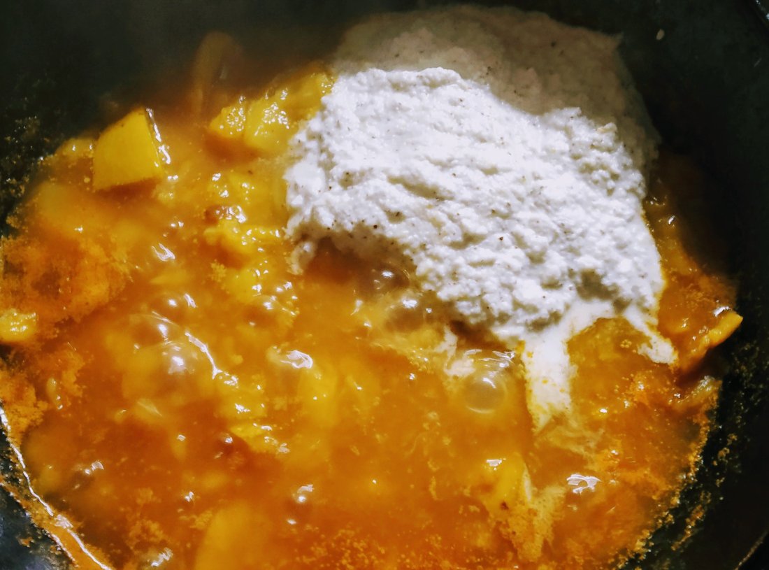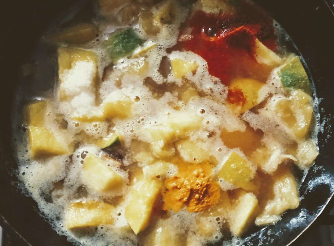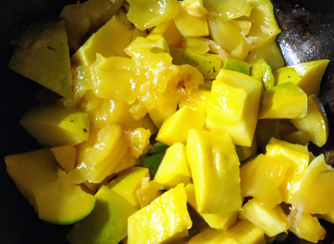 A pachadi that is synonymous for this season. Though both, the ripe mango and the jackfruit are sweet, the texture of the respective fruits, add a different and unimaginable dimension to this preparation. A very innovative method of incorporating fruits as an accompaniment to the main dish.
