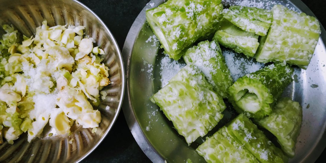 Clean the karela well. Now scrape the outside skin of the karela and keep it aside. Slit the karela and remove the seeds and add it to the scraped karela skin, add 1/2 tsp salt. Rub the karela with salt inside and outside. Keep aside for 15-20 minutes. Heat 1/2 tbsp oil. Roast the coriander, cumin, fenugreek seeds along with red chilli. Once the color changes, add the peanuts and roast it. Turn off the heat and add the tamarind and give it a stir. Cool it and grind them coarsely. Squeeze the mixture of the other skin and seeds and remove the extra water. Rinse with water. Do the same with the karela, rinse in water twice. Now add the grounded masala, one teaspoon salt, turmeric powder to the seed mixture and stuff this mixture in the karela. Heat the remaining oil in a pan and place the stuffed karela and close it with a lid. Reduce the heat and allow it cook slowly. Turn over the karela in between and cook it from all sides.