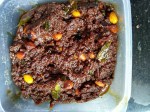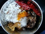 Grind together tamarind, coconut, jaggery,turmeric,salt and the fried ingredients add water to make a paste.