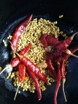 Heat 1 spoon of oil and add the asafoetida,coriander seeds, fenugreek seeds and red chillies,fry till they change colour.
