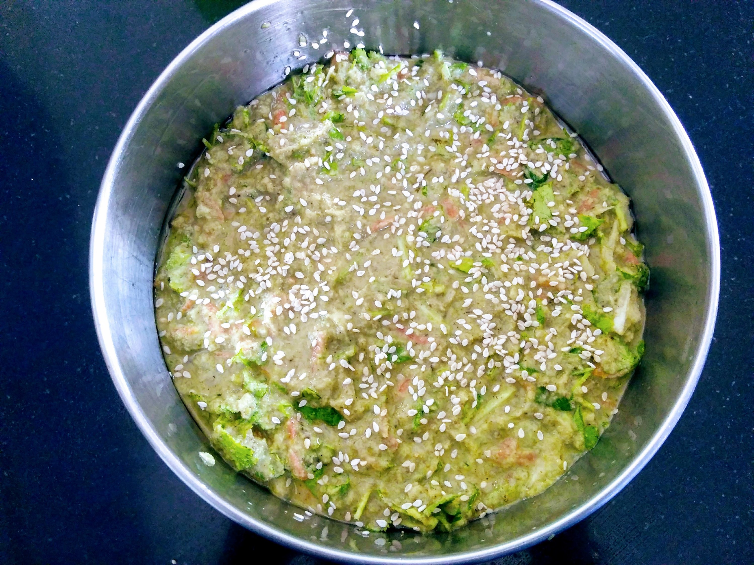 You have a cup of pesarattu mav , turn it into a healthy snack. Shred carrots, cabbage.Cut green chillies and coriander leaves. Mix all this to the pesarattu mav along with 1 teaspoon of chaat masala and little salt. Grease a vessel with oil ,pour in this mixture, sprinkle some till seeds and steam cook it for 10mnts. Remove from heat, cool it and cut into cubes. Sallow fry it and enjoy pesarattu tikki