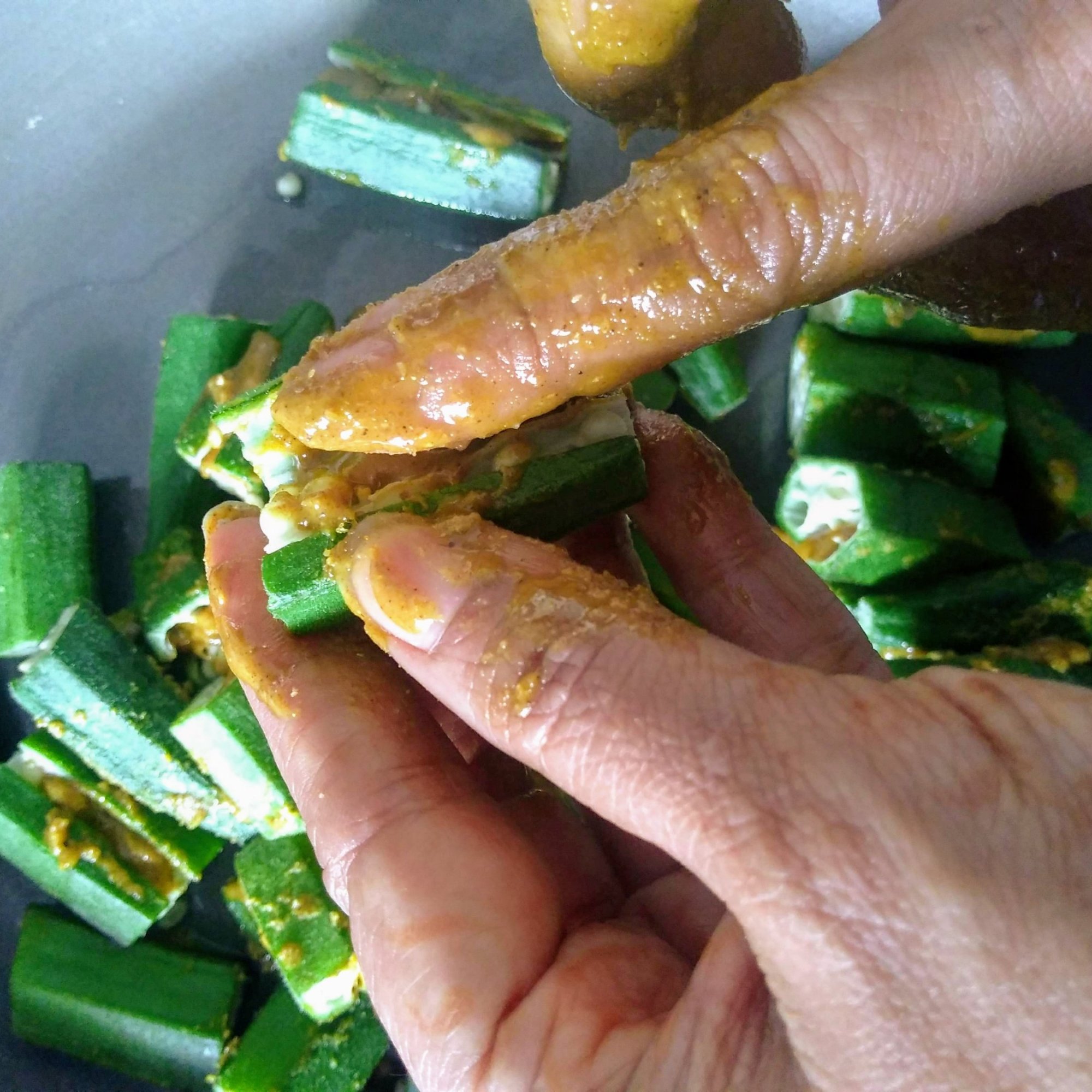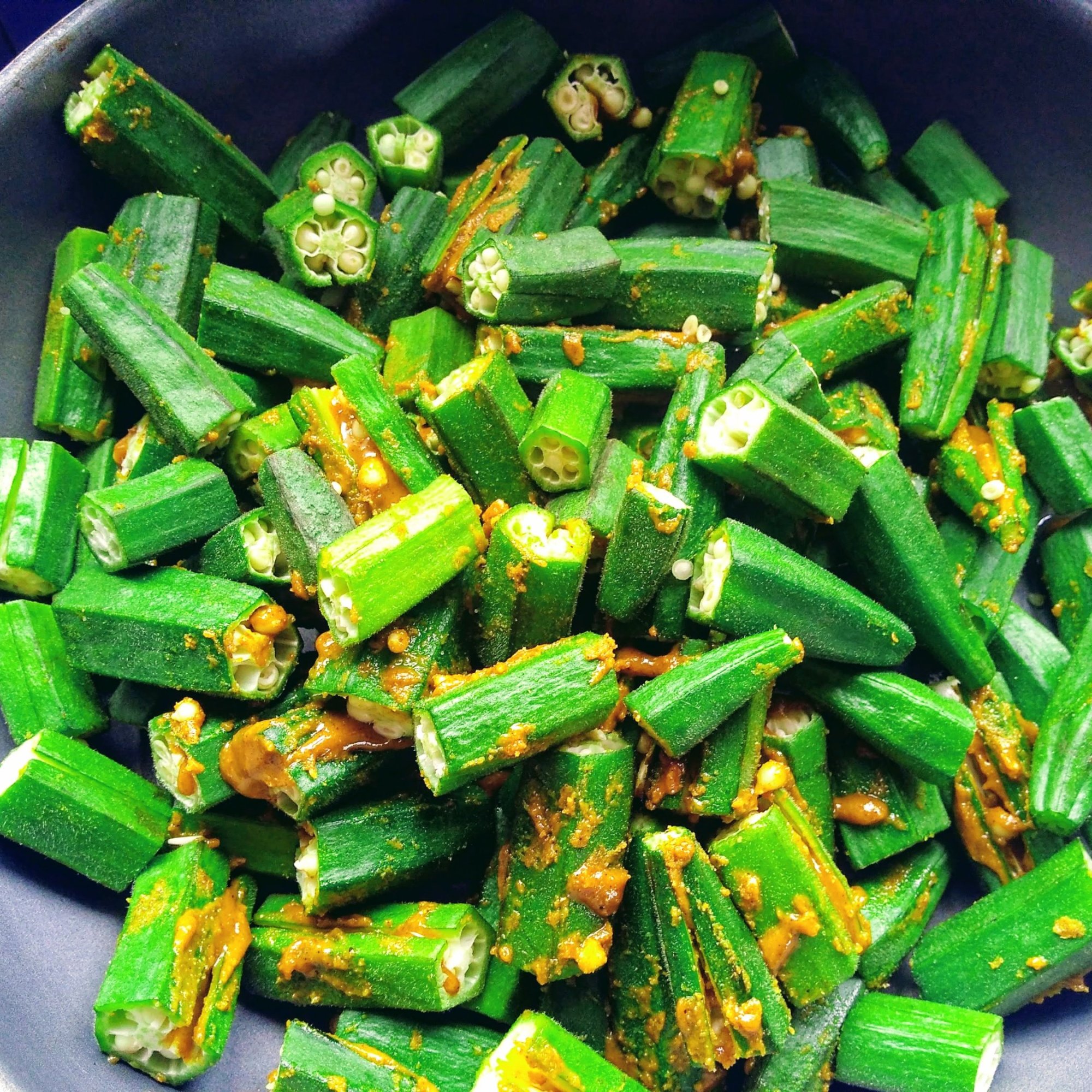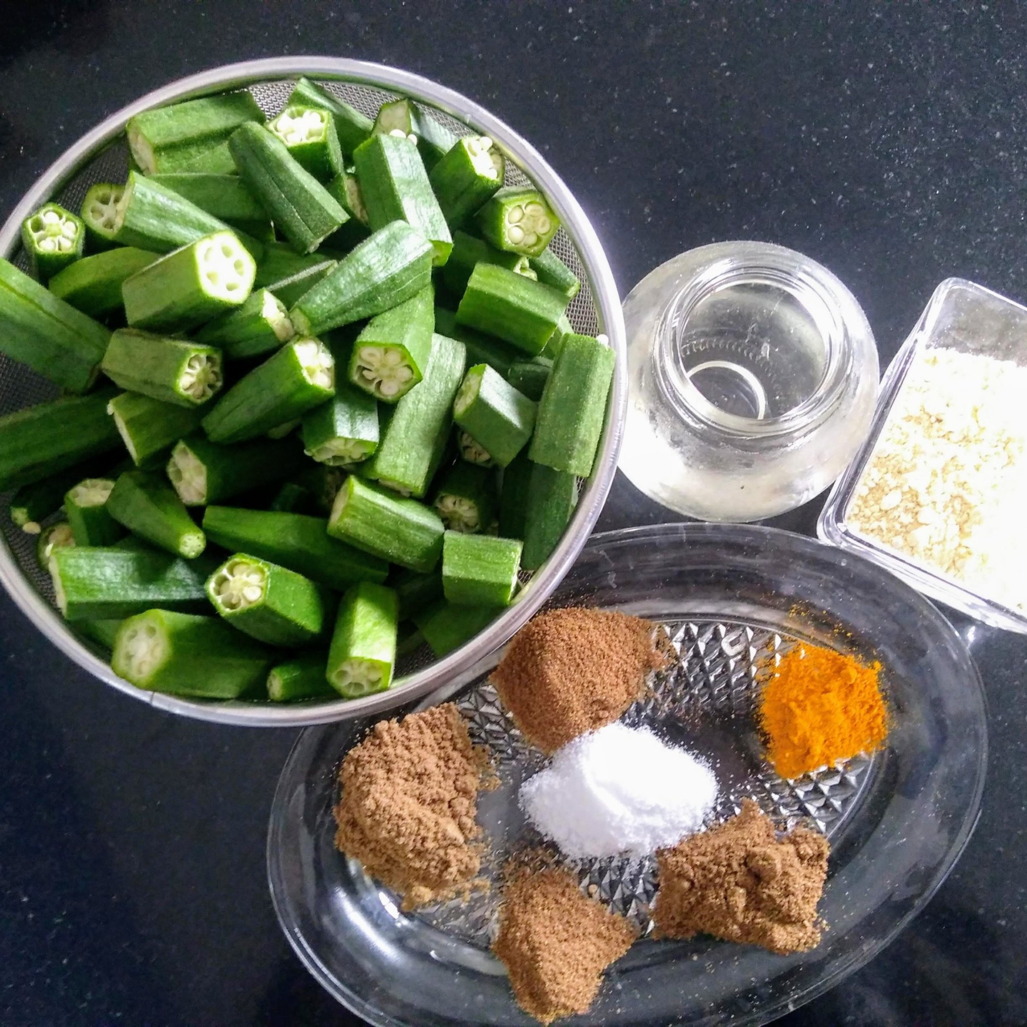 Wash and dry pat the bhindi, slit the bhindis. Take a bowl mix together the besan with all the spices ,add oil and mix everything together. Now stuff the bhindis with the spice mix . Heat a pan ,add oil,add the stuffed bhindi ,saute them. Cover and cook them in low heat. Stir them in between so that the bhindi’s don’t get burned. Cook till the bhindi’s are fried completely. Enjoy Bhindi fry with hot chapathis.