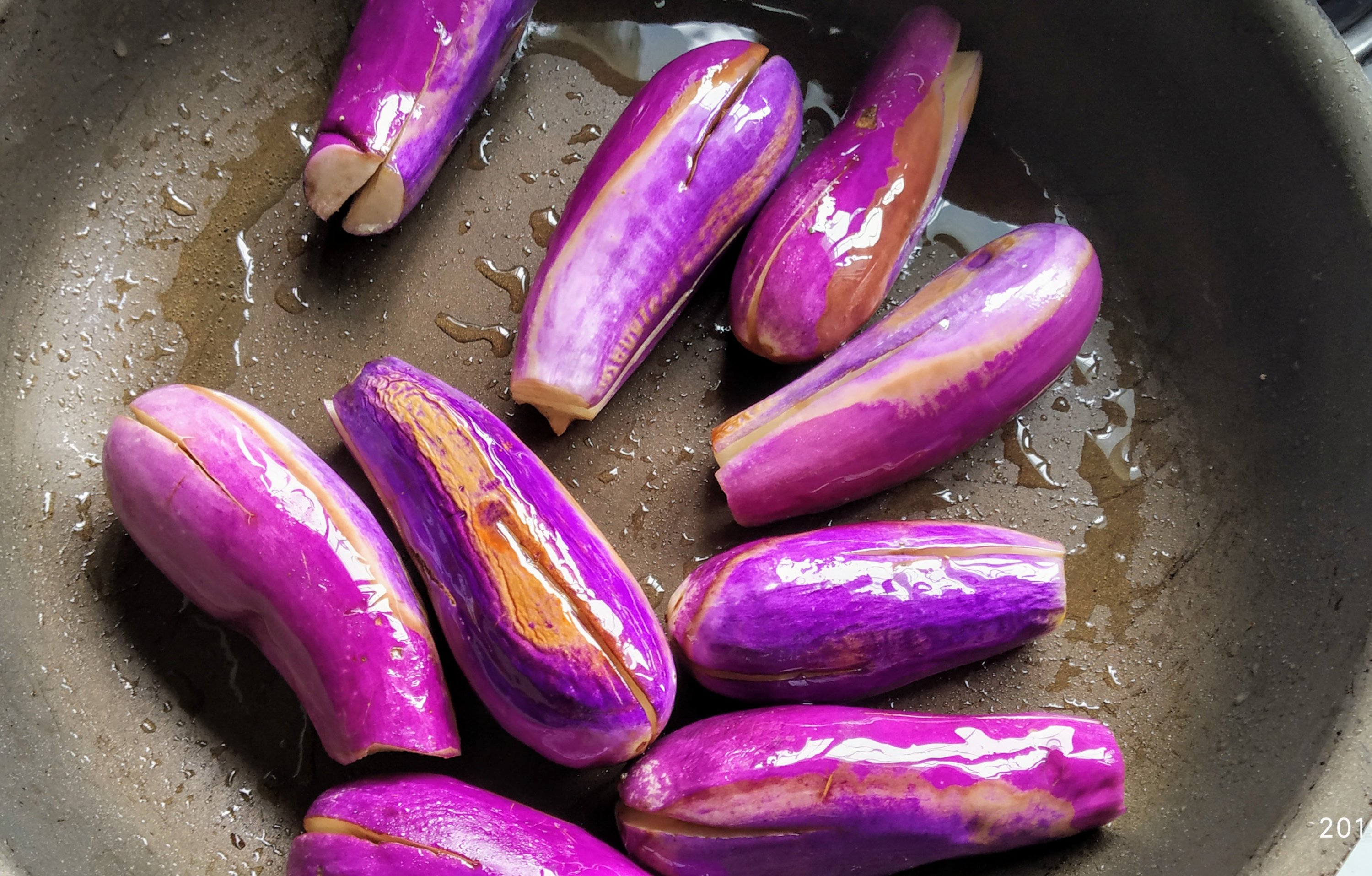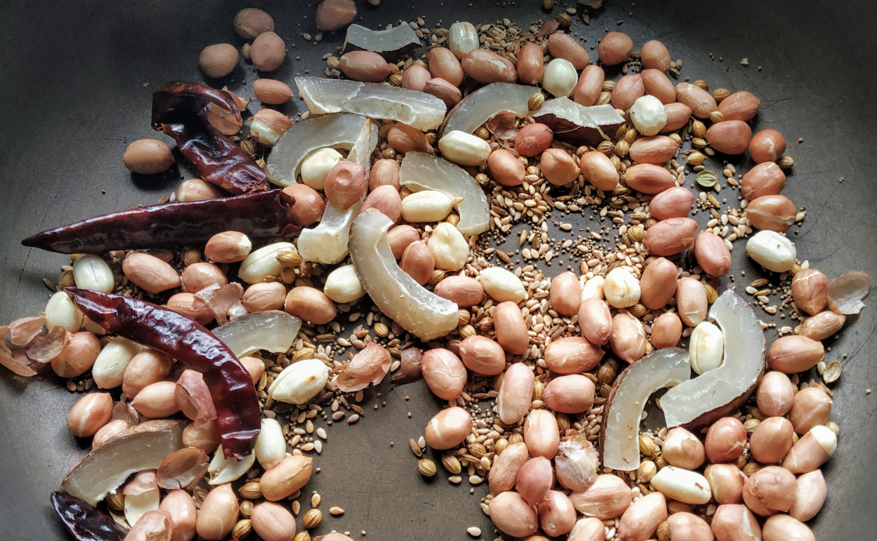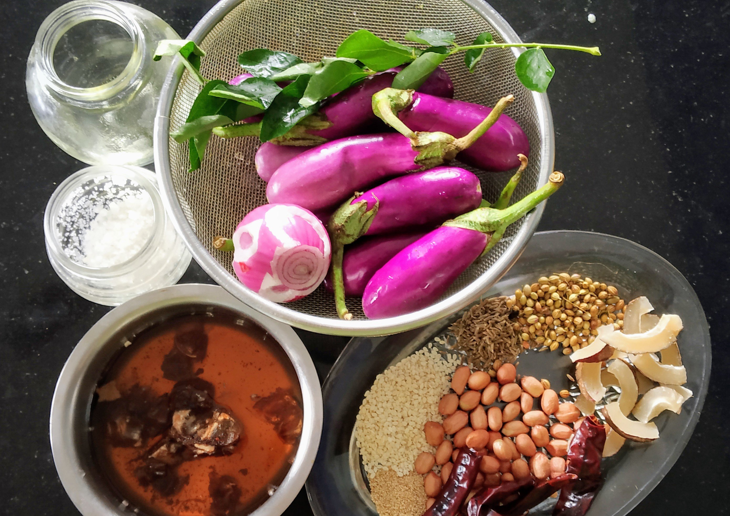 Wash and dry the baingan. Cut the stem and slit them in four keeping the base intact. Soak the tamarind in water. Dry roast all the dry ingredients, and grind them. Heat 1 1/2 teaspoon oil and lightly fry the baingan till they look soft. Remove and keep aside. Heat the remaining oil and saute the ginger-garlic paste,then saute the cut onion with curry leaves till the onion tuns pink. Now add the baingan,saute for a minute and then add the grounded paste, cook for 2 minutes and then add the tamarind juice and salt, lower the heat ,cover and cook till baingan are very soft and cooked thoroughly.