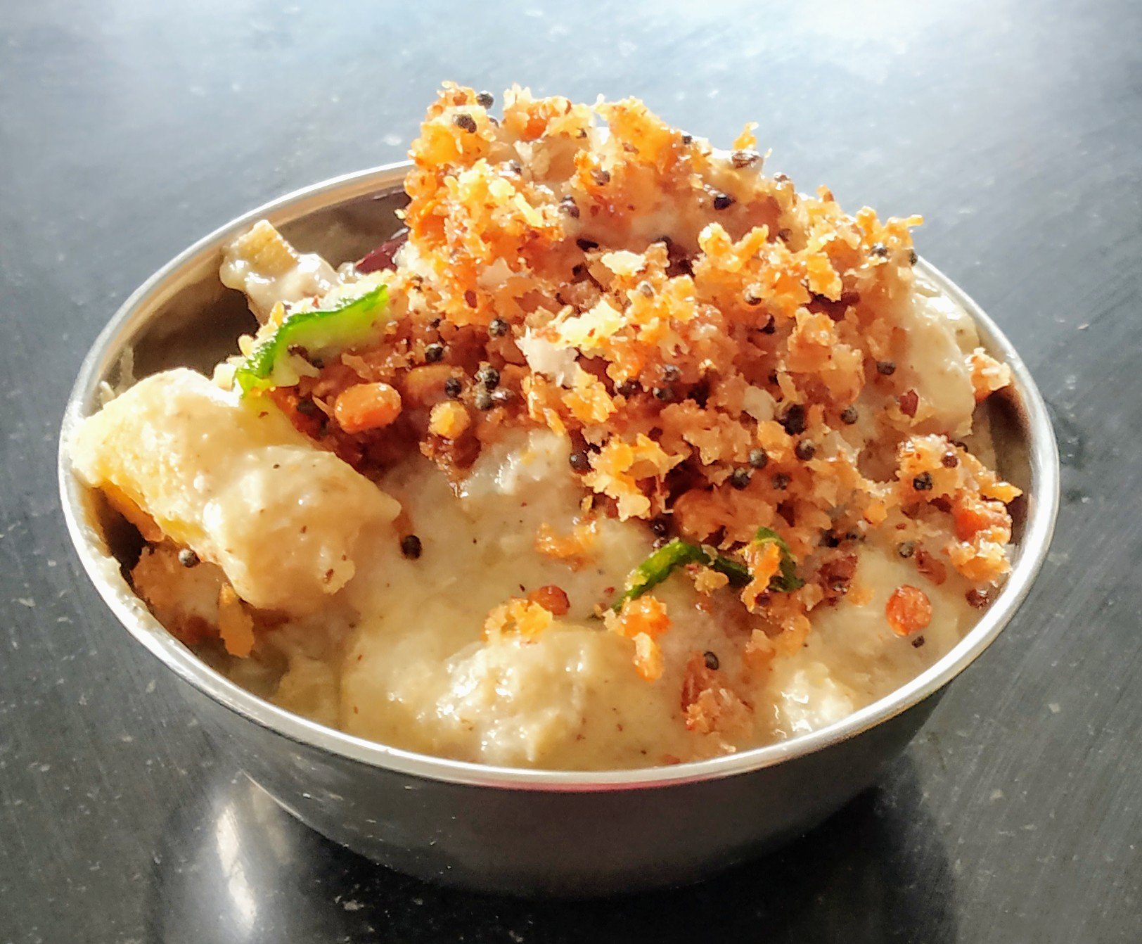 I make Erissery in two ways, one with Mathanga and Karamani, which is a form of kuttan, and Chenai vazhakkai Erissery which is a thick variety, a side dish. The one I have prepared here is a thick side dish. Here i have used the normal vazhakkai, but the traditional method is by using nendram kai/ Kerala banana.
