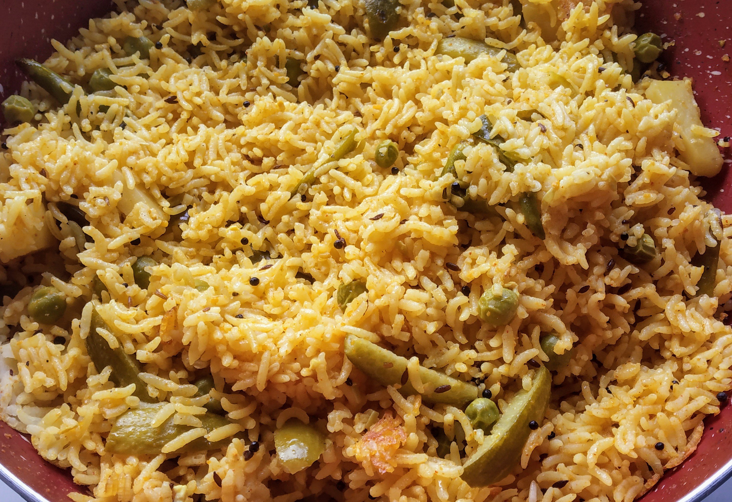 Rinse the rice and keep aside for 15 minutes. Heat ghee in a pan, add mustard seeds, when they crack add the cumin seeds,saute. Add the chili’s and curry leaves, saute. Add the rice and saute them for 2 minutes, add the vegetables and further saute for 2 minutes. Now add the turmeric pwd, red chili pwd, goda masala and salt, pour in water . When the water starts to boil, add the curd, give it a stir, lower the heat, cover and cook till the rice is done. Enjoy spicy Masala Rice.
