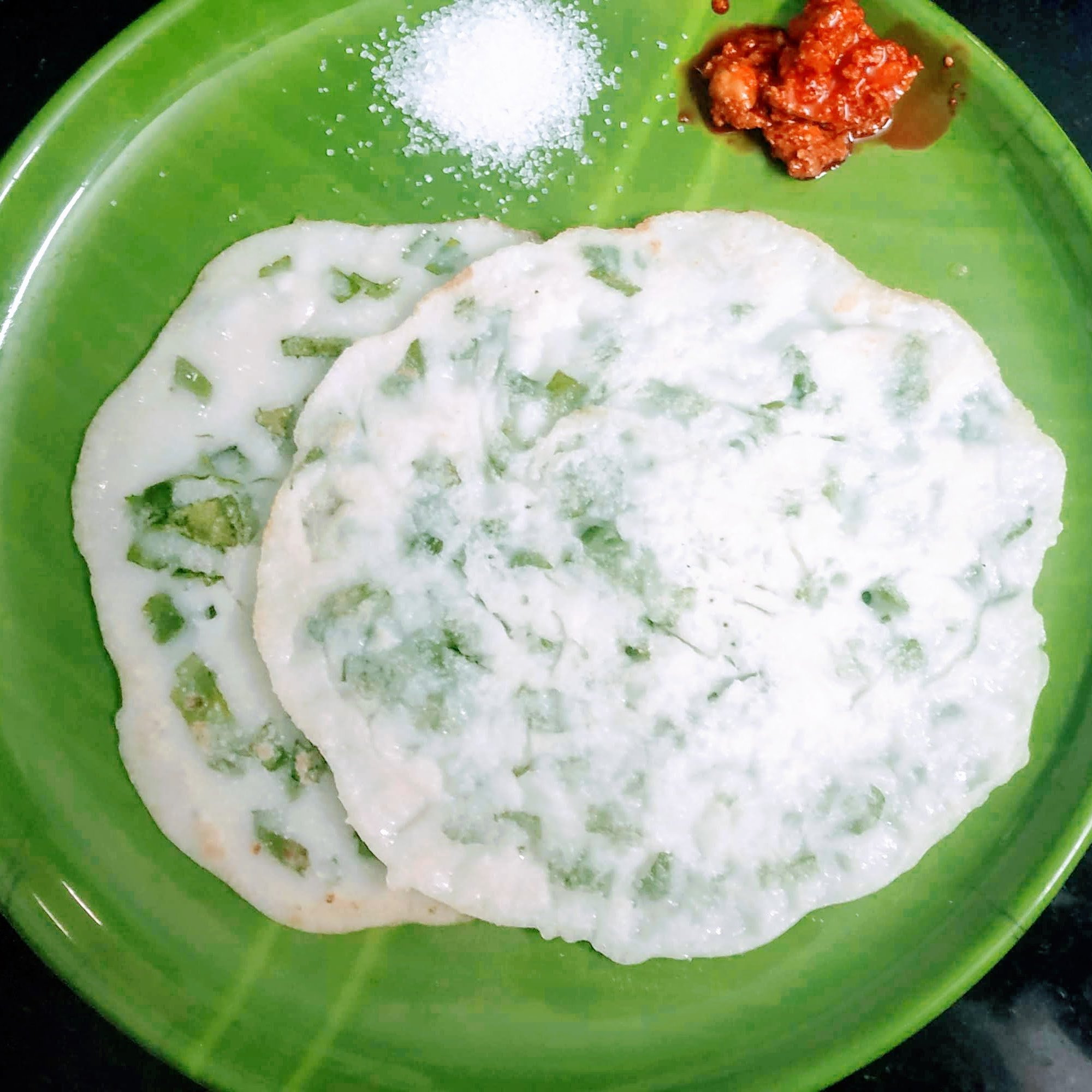 The simplest dish one could prepare. Varam arsi literally means only rice . Murungai ilai /drumstick leaves varam arsi adai is an age old recipe . Here again the twist is given by my grandmother ,instead of murungai ilai she added chopped Palak,the influence of Bombay. Choice is yours,whether it’s murungai ilai,palak and simply scrapped fresh coconut, once added the adai is irresistible.