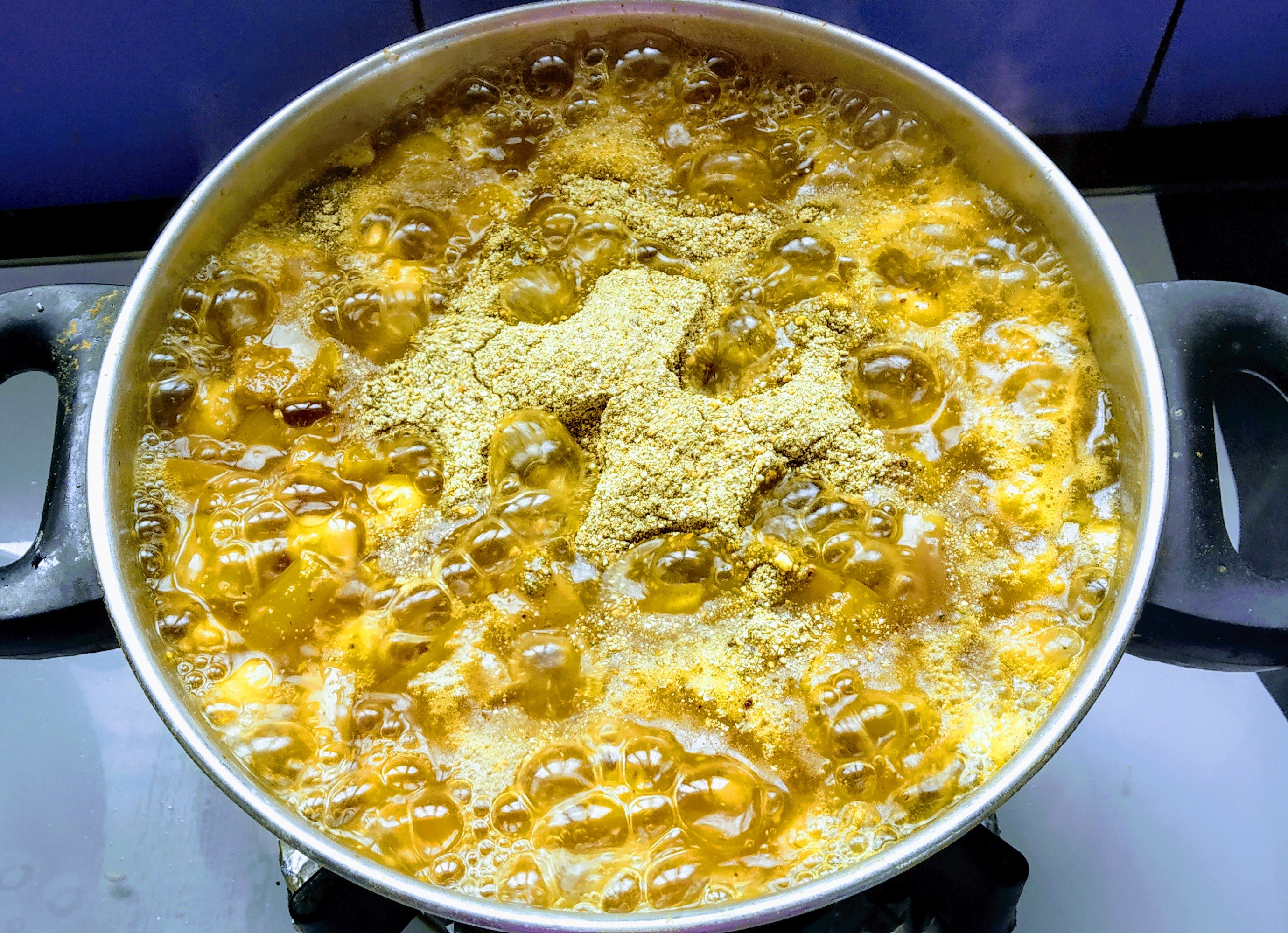 Soak the kondai kadalai for minimum 6 hours and pressure cook them. Cut the brinjal into small pieces and keep them immersed in water till you cook it to avoid discoloring . Soak the tamarind in an glass of water and remove its juice. Remove the brinjal from the water. Cook the brinjal in tamarind juice adding salt and turmeric. Meanwhile in a pan dry roast the pepper and cumin seeds ,keep aside . In the same pan dry roast the urad dal and raw rice till they change colour ,add the curry leaves,stir .when the curry leaves becomes dry remove from heat. Cool all the fried ingredients and powder them coarsely . Once the brinjal is cooked add the cooked kondai kadalai ,give it a stir and further cook for 2 minutes . Now add the grounded powder and cook for further 2 minutes . Put of the heat. Heat oil ,add the mustard seeds,when they crackle add the scrapped coconut and fry till they the coconut turns red in colour. Add this tempering to the kootu. K^4 is ready .