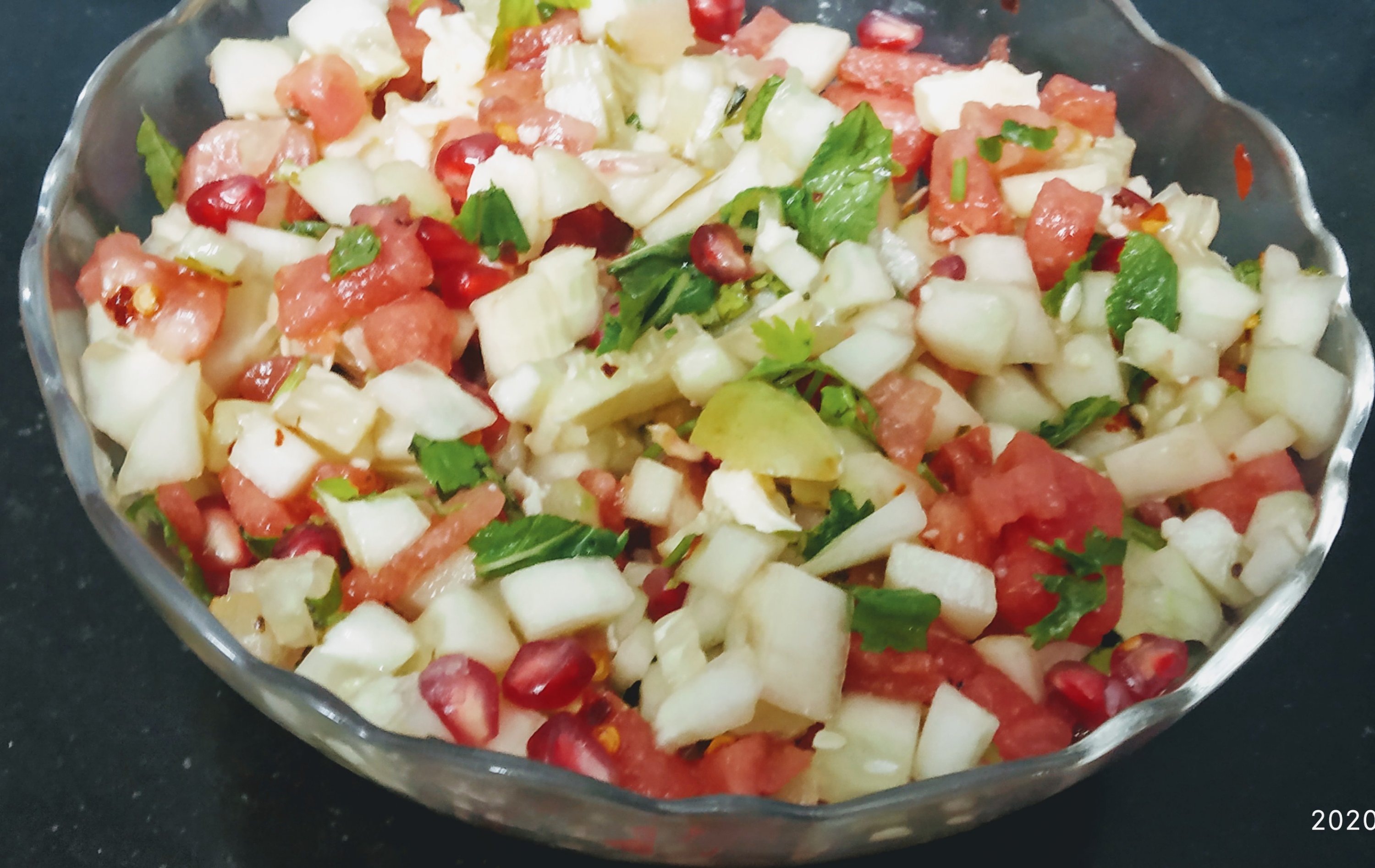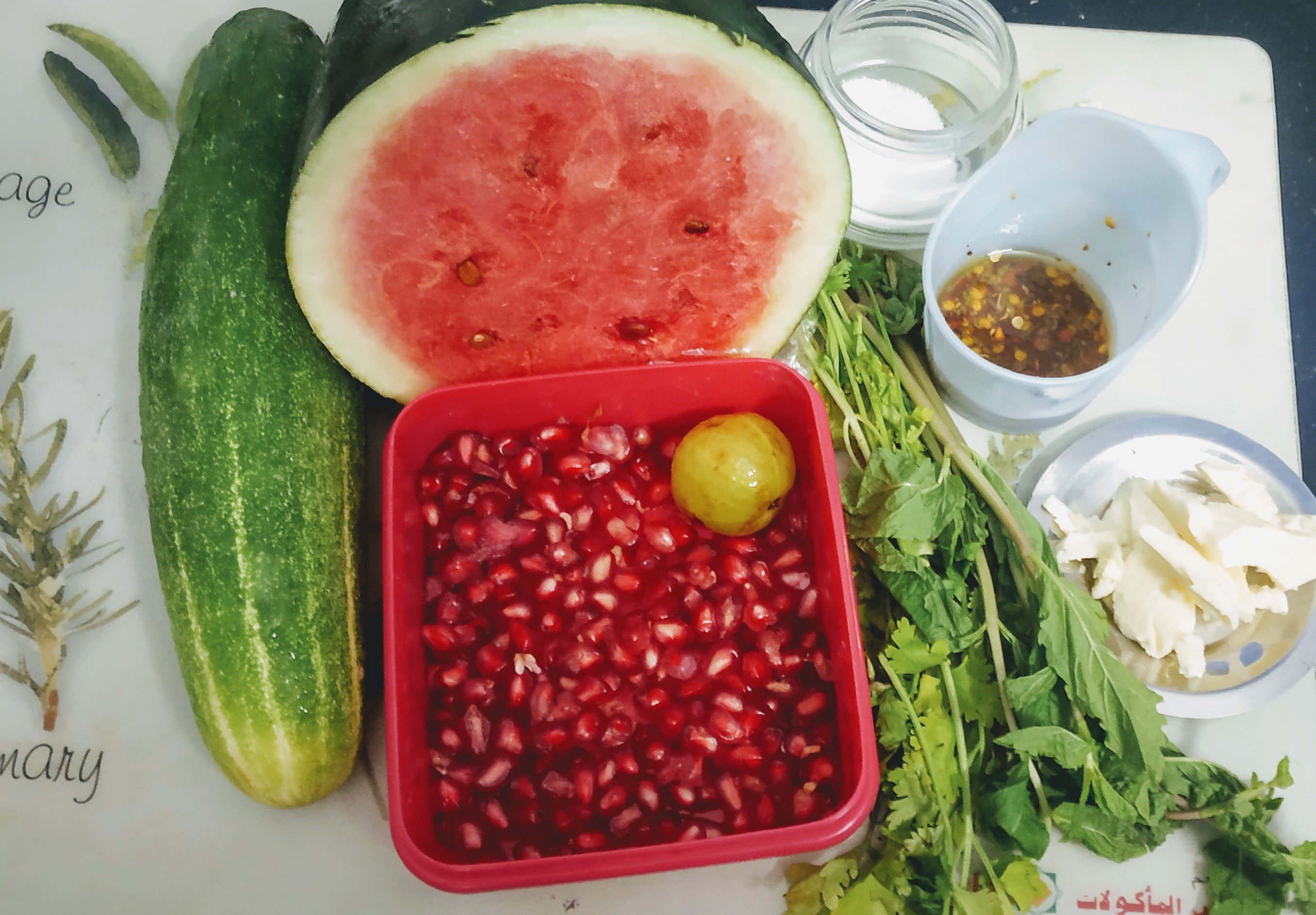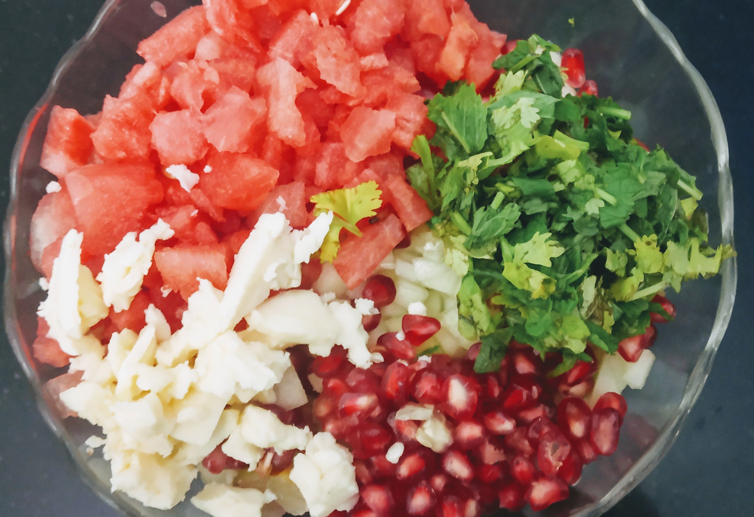 Remove the skin of watermelon and cut into small cubes . Peel cucumber and cut into small cubes. Cut coriander,mint,gooseberry, cheese . Transferal the cut ingredients and toss them together. Add all the ingredients of the dressing into a bottle and give a good shake. Pour the dressing over the salad ,add salt ,toss them again . Your Watermelon summer salad is ready. Enjoy it anytime of the day.