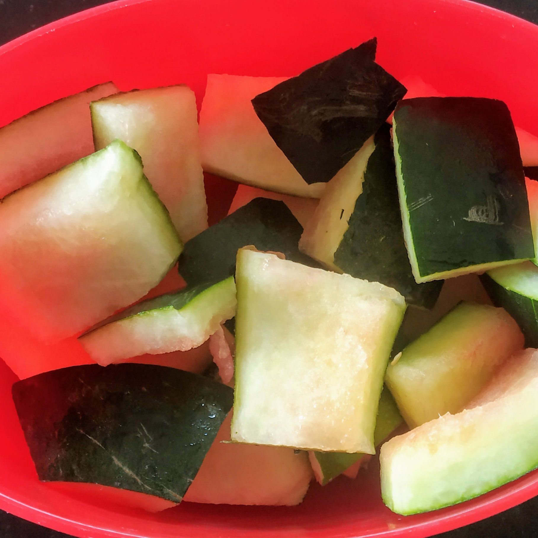 Watermelon rind is watermelon skin. Everytime you make juice or salad with watermelon you throw away the skin. The other day I was talking to my mother and she said that after making watermelon juice, when she was going to bin the skin/ rind her helper asked her doesnt she use the skin to make kootu with it,my mother made it and said it tasted great . That’s what made me try dishes with it. Watermelon rind has many nutritions value. Found from google that it has high content of Vitamin A, Vitamin C, potassium, Vitamin B6 and zinc. It is loaded with citrulline, chlorophyll, amino acids, lycopene, phenolic compounds and flavonoids.So here’s my version of watermelon rind mulakushyam,the easiest and simplest dish but with lot of nutrition .