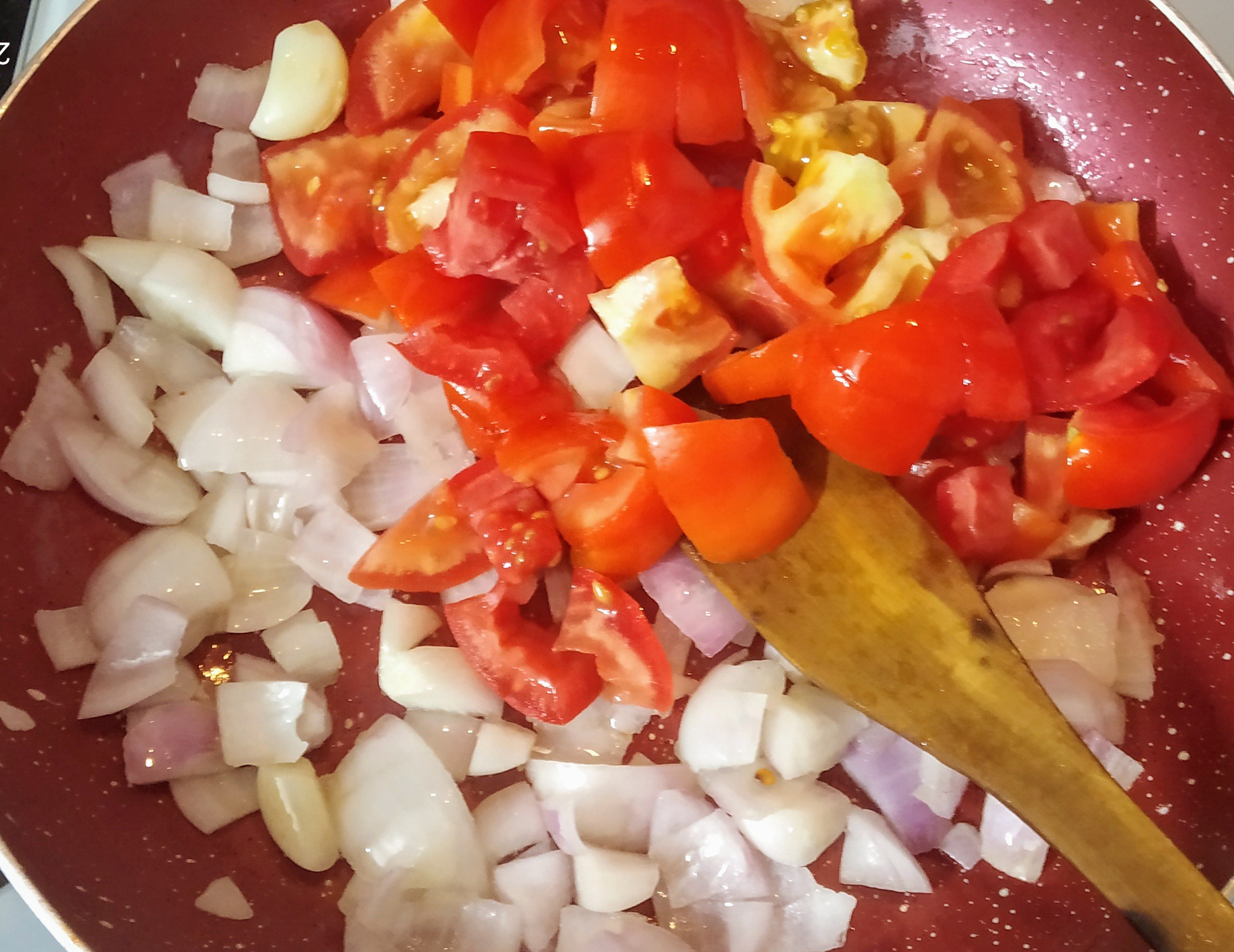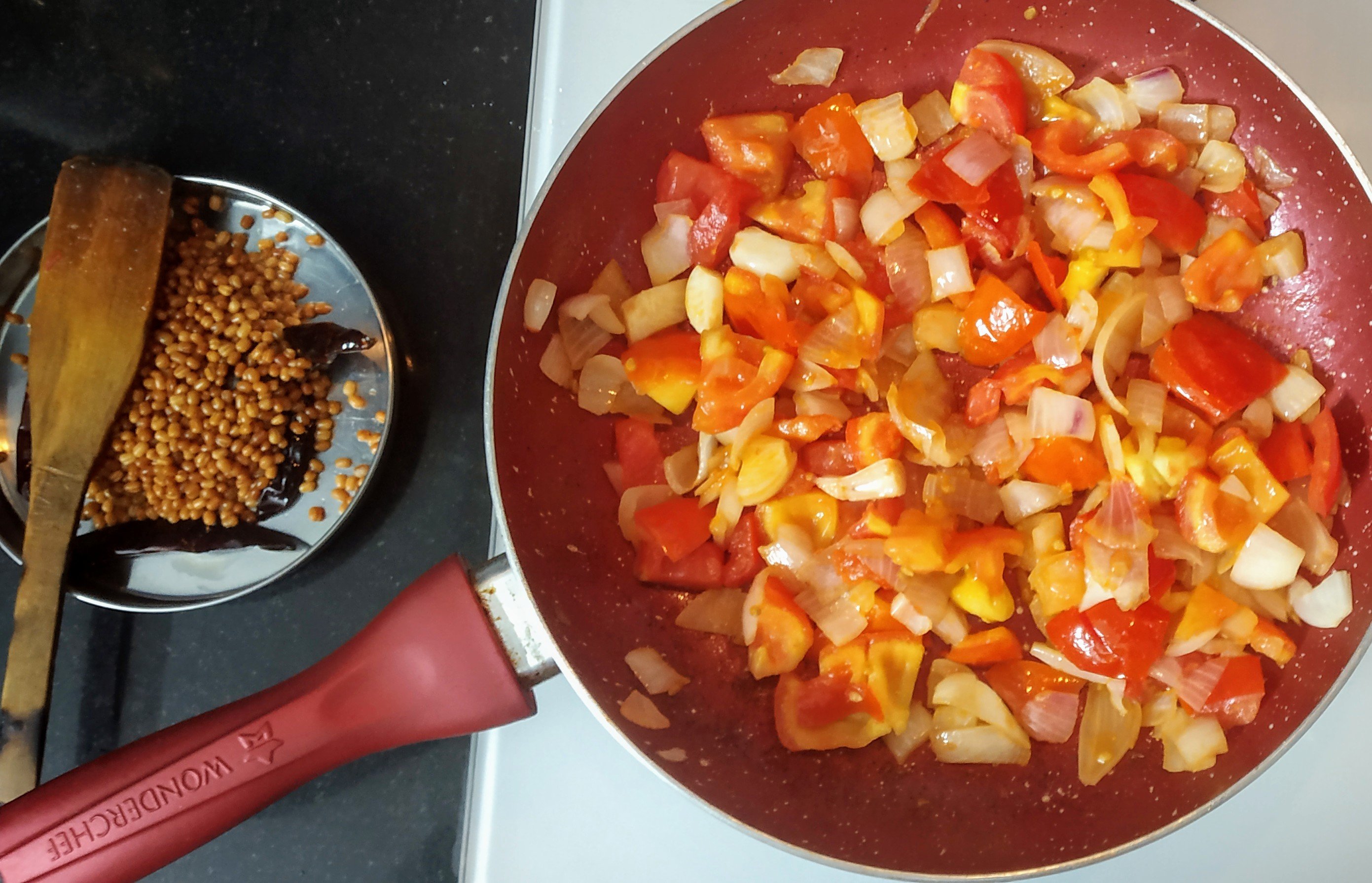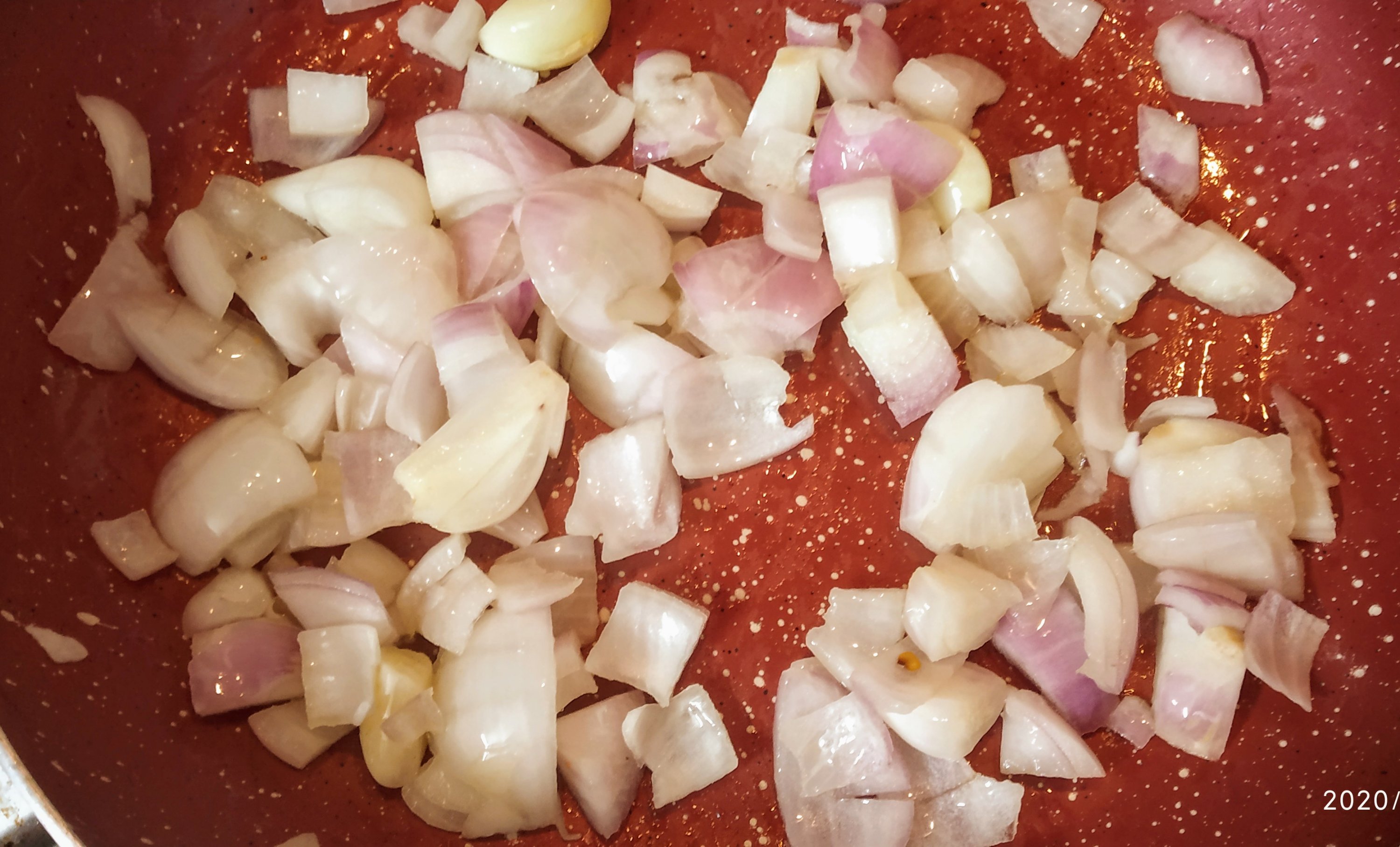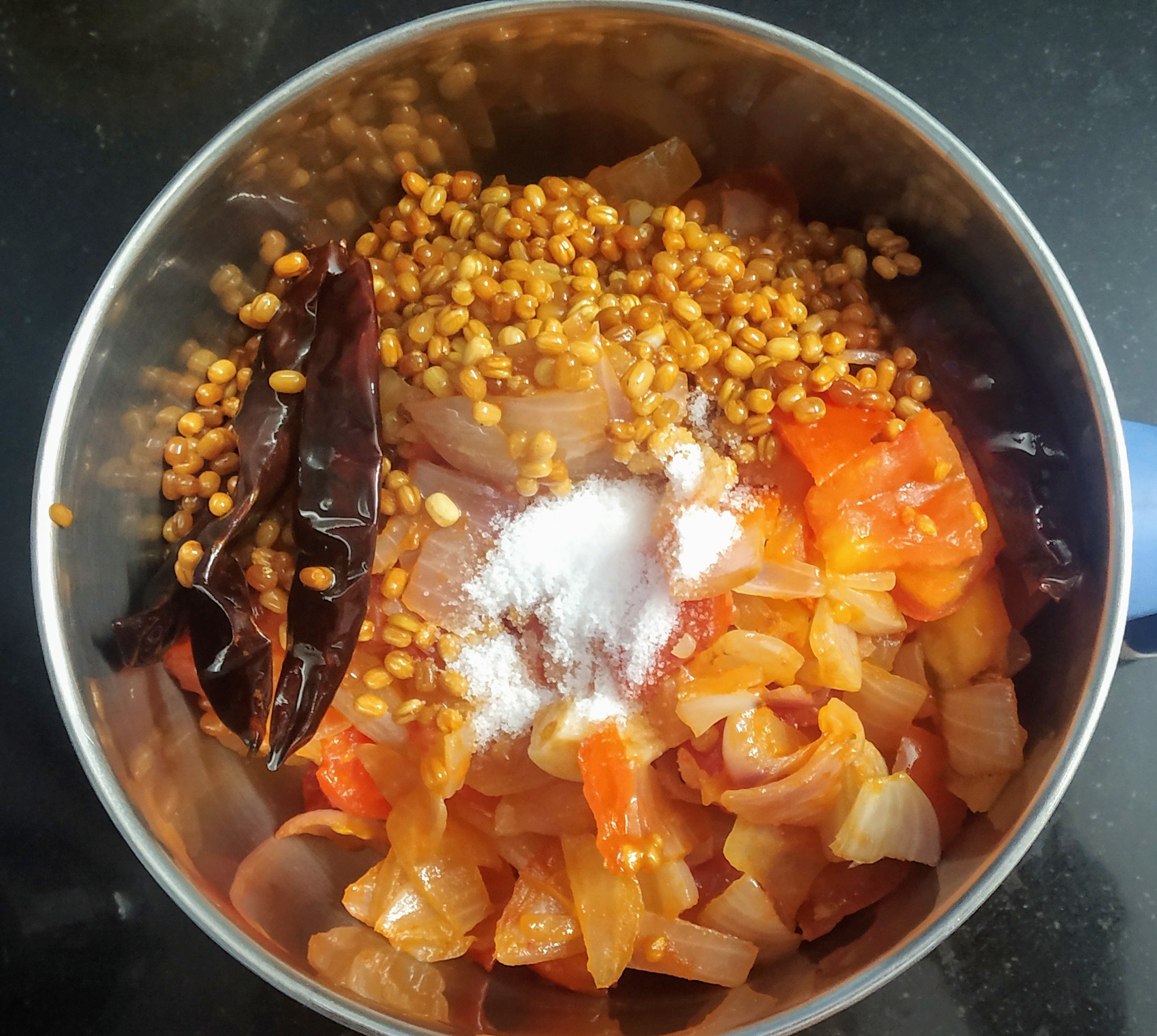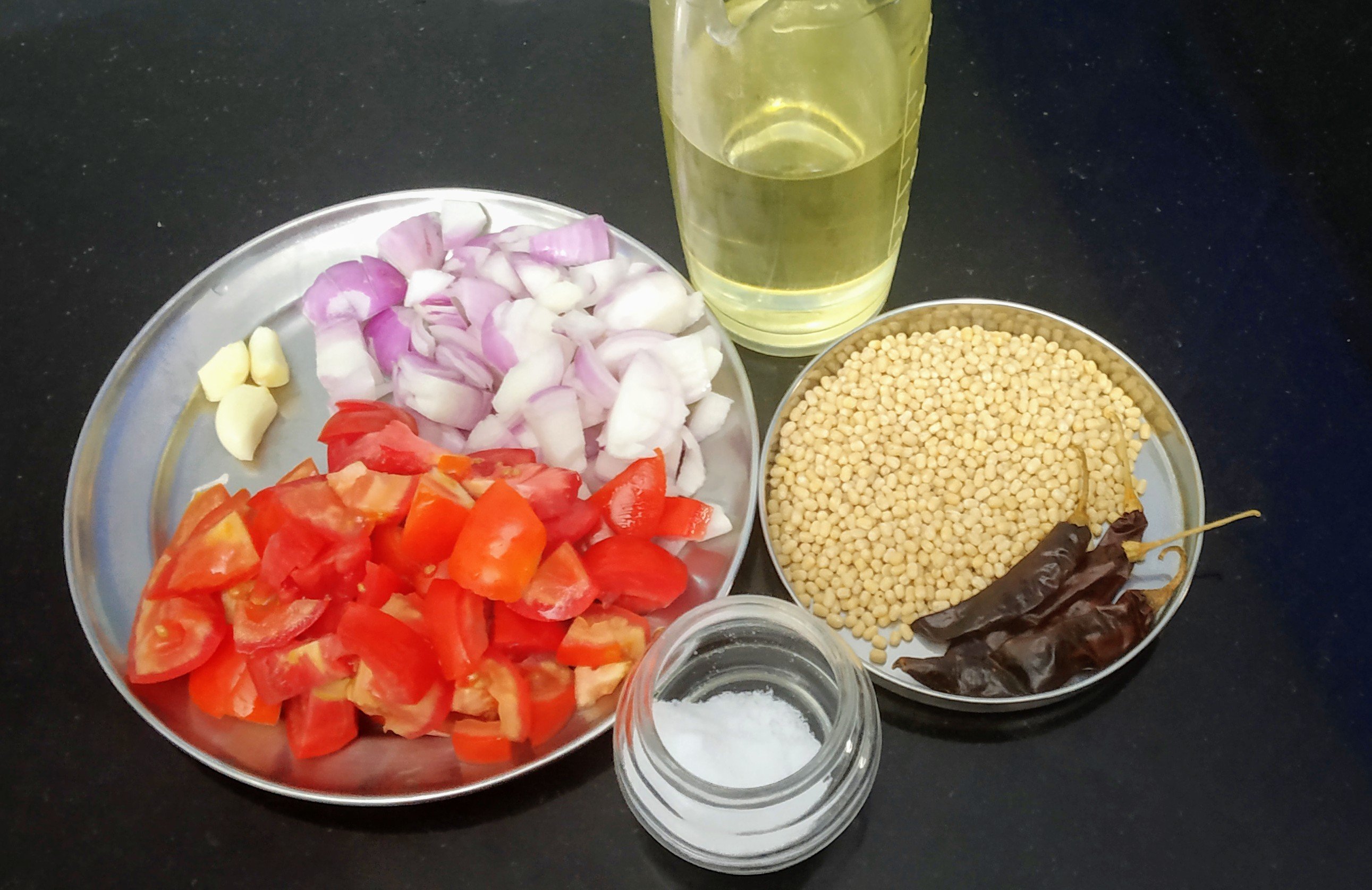 Heat a spoon of oil and fry the urad dal till the dal changes colour. Remove and keep aside. Now heat the remaining oil saute the chopped onion and garlic till it turns translucent. Add the chopped tomatoes and saute for 2-3 minutes. let them cool and grind everything together with salt. Tomato-onion chutney ready.