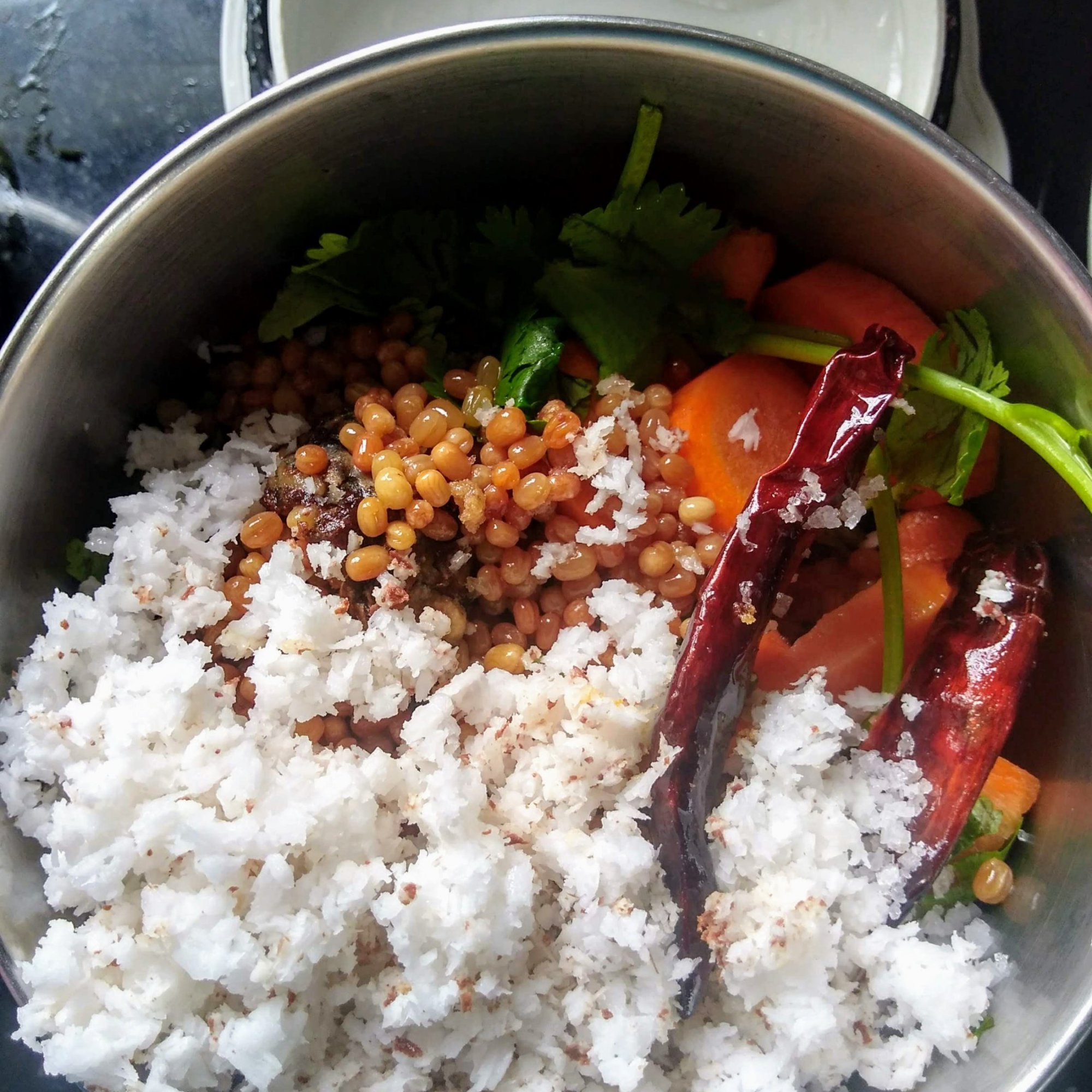 Thogayal is a coarsely grinded paste with coconut and fried dal. Here I have a little healthier version of thogayal. I have reduced the qantatiy of coconut and added lots of carrots and fresh coriander. With the rain everywhere, just try this thogayal with hot rice.