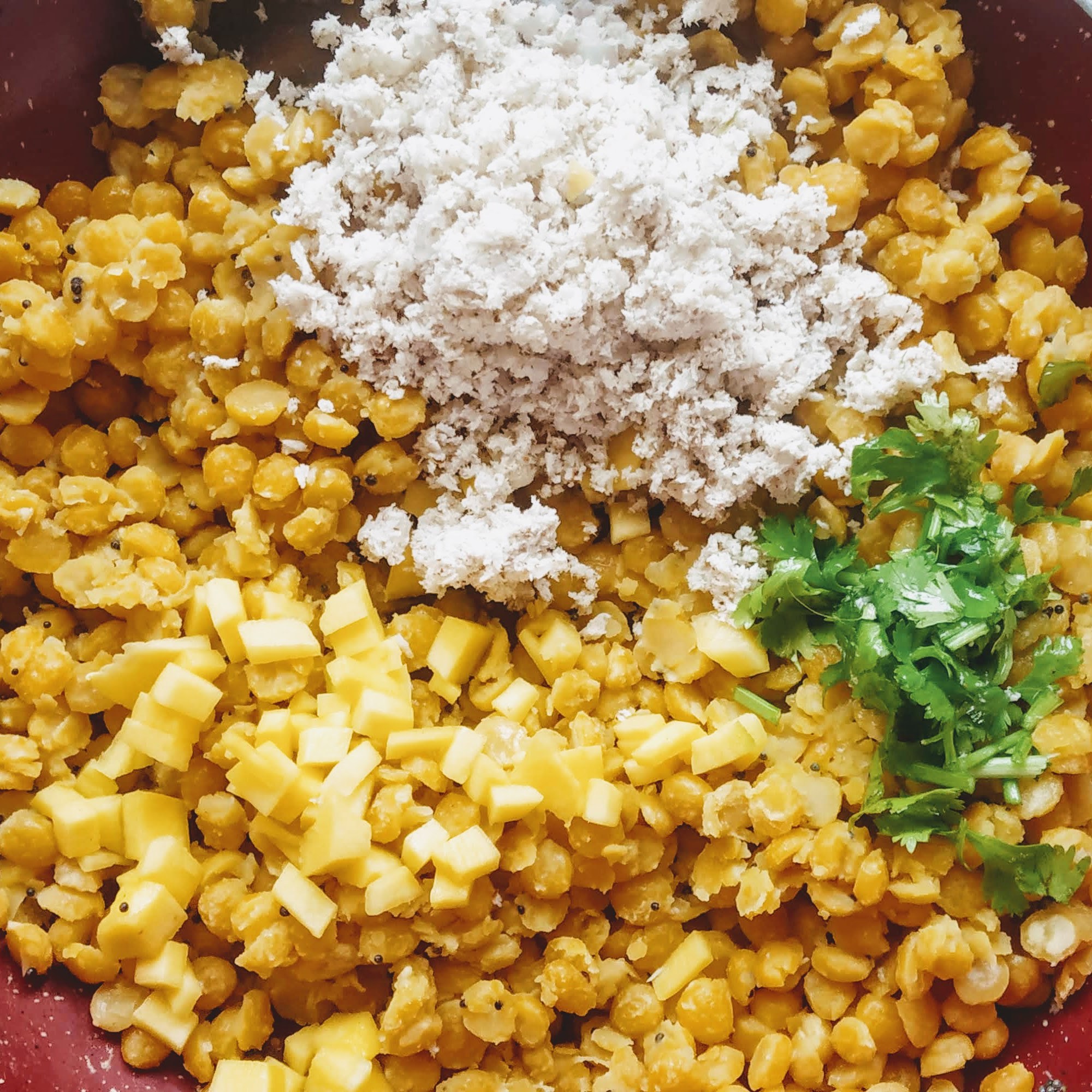 Another humble sundal recipe, kadalaparuppu sundal can also be prepared on a day when you struggle to make a poriyal/poduthuval for the main kozhambu/kootaan. I’ve added small chunks of raw mango, which gives a lovely zesty flavour to the sundal.