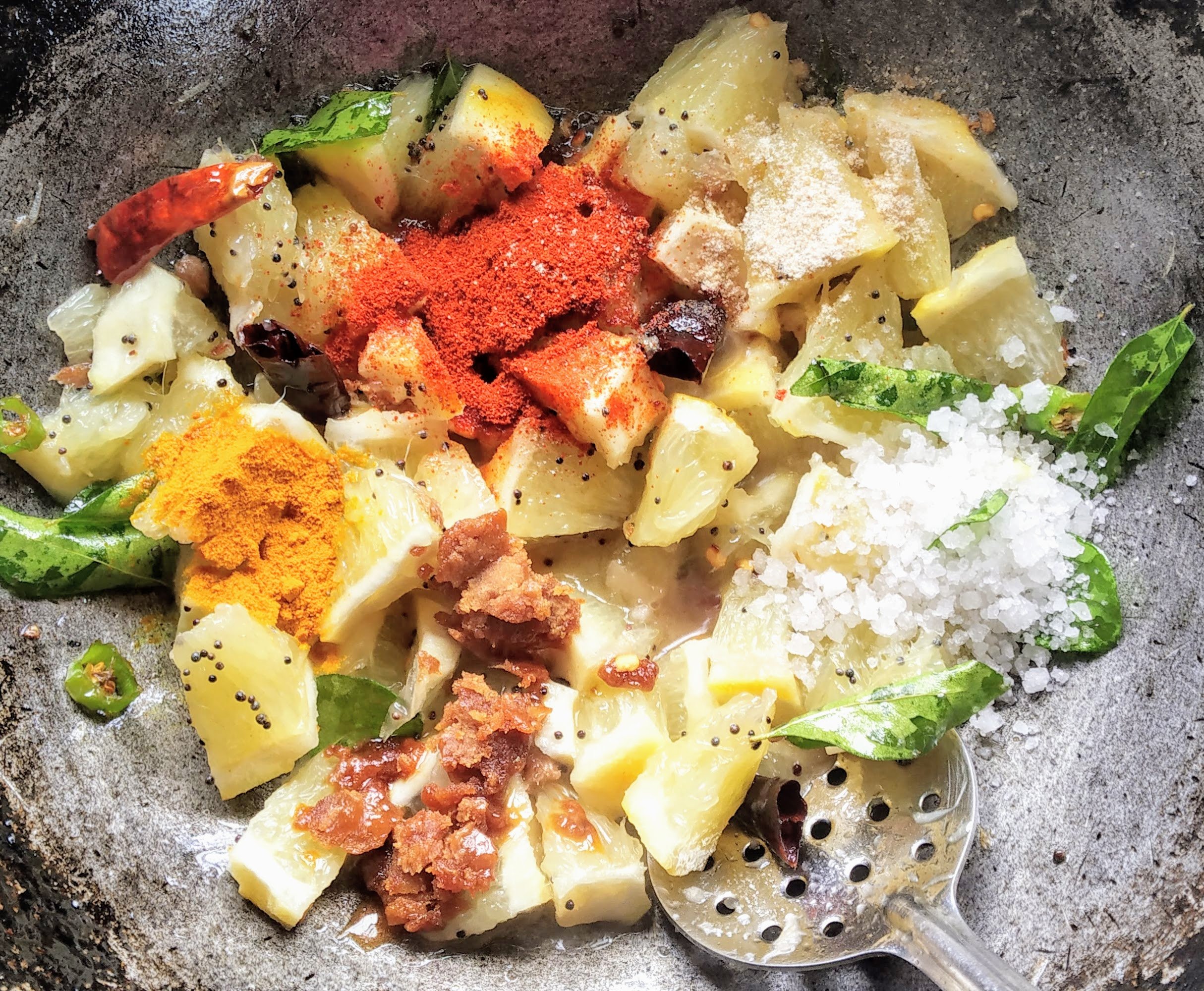 Vadukapuli narthangai or wild lemon has its season around August-September,which is around the time Onam festival is celebrated. Usually a pickle is made of it and served for the sadya or feast on Onam. This pickle can be stored in fridge and be used for atleat two months.