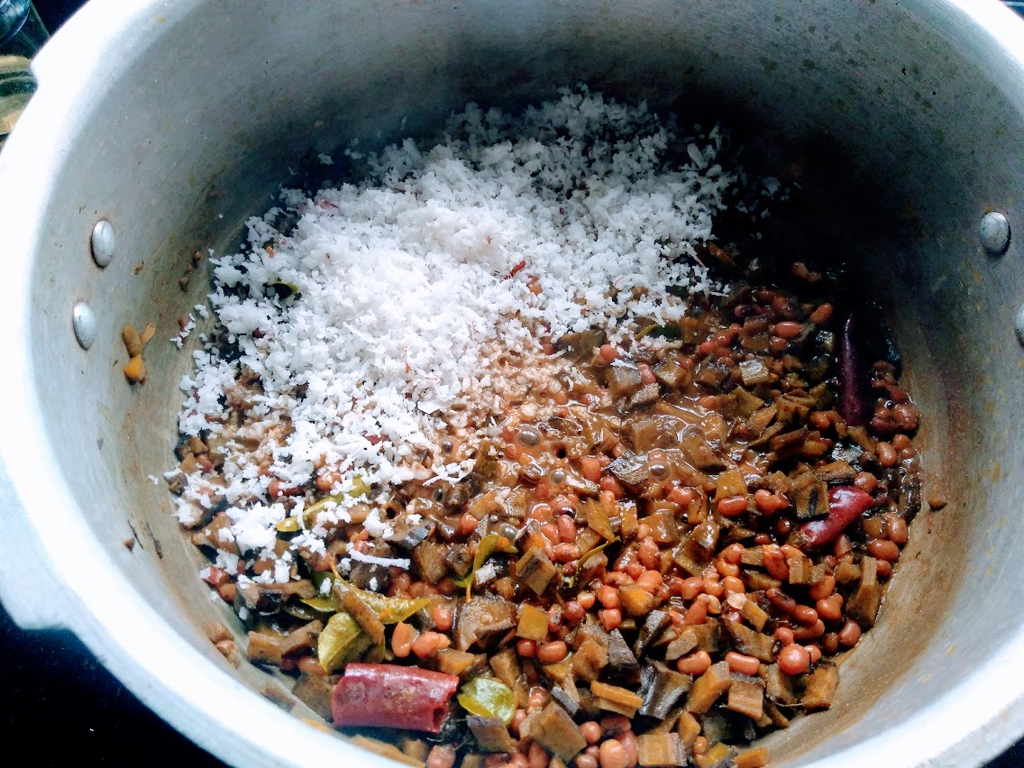 Peel and remove the skin of the kai.(please ref to above link). Cut the skin into small pieces and immediately put it into a vessel with water, this will prevent the discolourization of the skin. Pressure cook the karamani. Remove the cut kai skin from water and rinse it once again. Add 3/4 glass of water, with turmeric powder and salt and cook the kai skin for 10 minutes. Now add the cooked karamani ,dry red chili ,give a stir,lower the heat , cover and cook further 5 minutes. Add the coconut , mix everything together and put of the heat. Drizzle the coconut oil,add the curry leaves and enjoy Kai puzukku with red rice kanji.