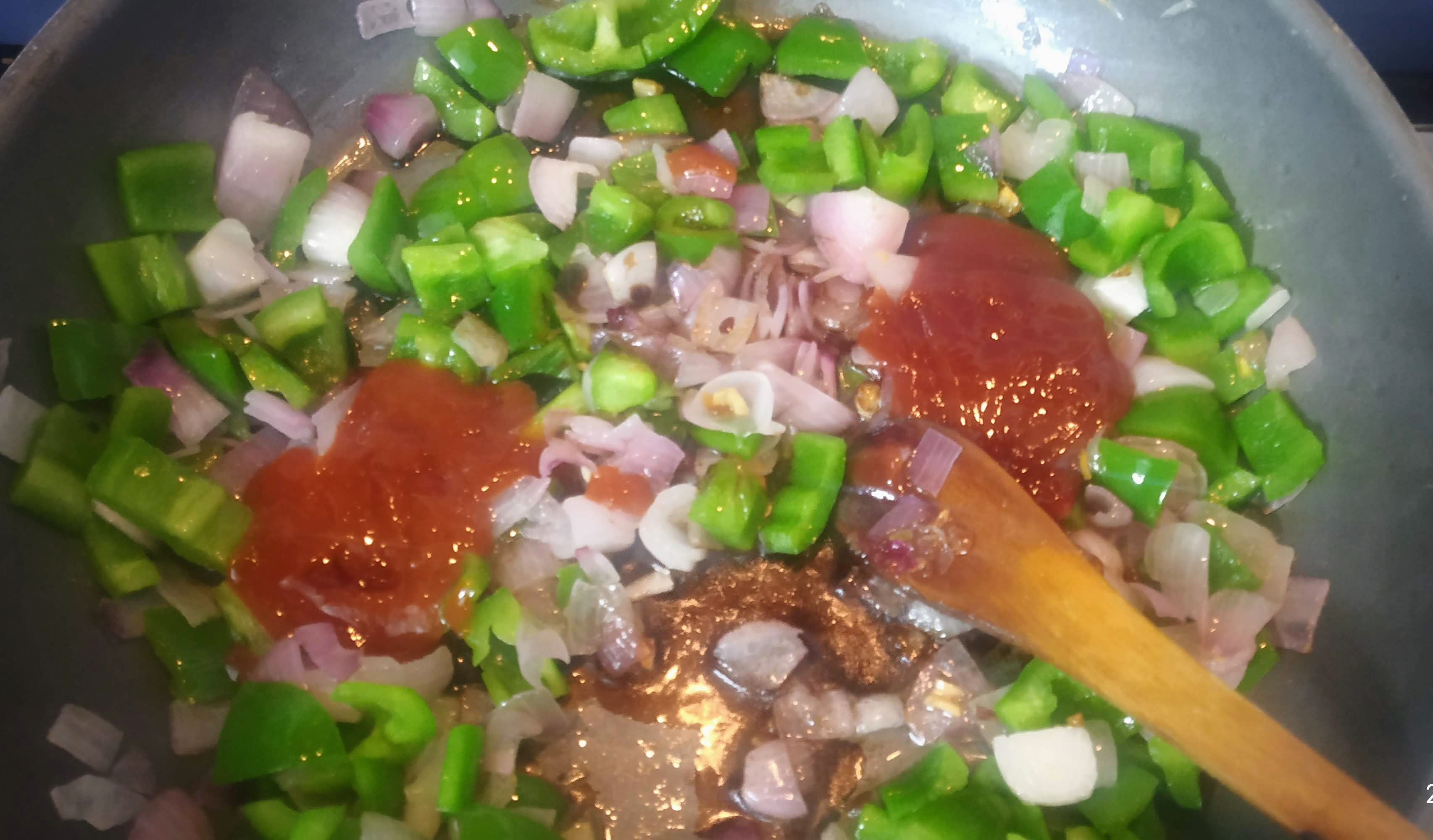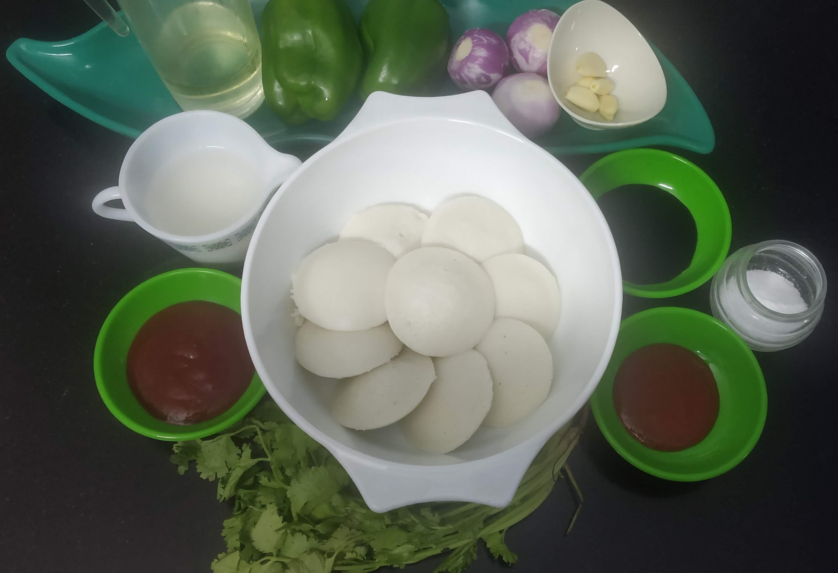 Prepare idli and allow it to cool .( If you plan to prepare idli Manchurian for dinner, then you can make the idli in the morning .) Cut the idli into six pieces. Heat a pan with 3-4 tbsp oil and add the idli pieces. After a minute, toss the idli and shallow fry the idli. Once all the cut pieces are fried, keep them aside. In the same pan, heat 2-3 tsp of oil. Add garlic and sauté. Now add the chopped onion and sauté until the onion turns pink. Add the capsicum and sauté everything together for two minutes. Now add in the tomato ketchup, chilli sauce and soya sauce, give it a stir and cook for a minute. Meanwhile mix corn flour in 2 cups of water. Add this to the the pan and mix everything together. Cook for 2 minute and put off the heat. Add the fried idli and mix it with the vegetables. Your Idli Manchurian is ready. Garnish with fresh coriander leaves or chopped spring onions. Serve Idli Manchurian hot.