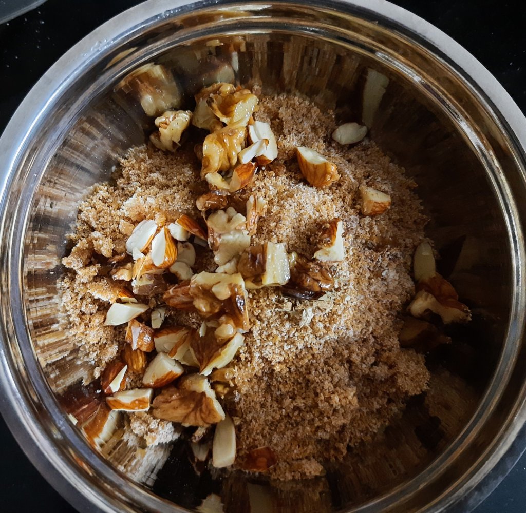Dry roast the aval in a pan till the aval changes coour. Cool it and blend it in a mixer coarselly. Add the jaggery and blend it again. Heat 1 tbsp ghee and fry the chopped dryfruits add this to the aval mixture, add cardamom pwd mix everything together. Heat the reamining ghee,, add to the aval mixture. Use a spoon mix the ghee with the aval mixture and make ladoos.