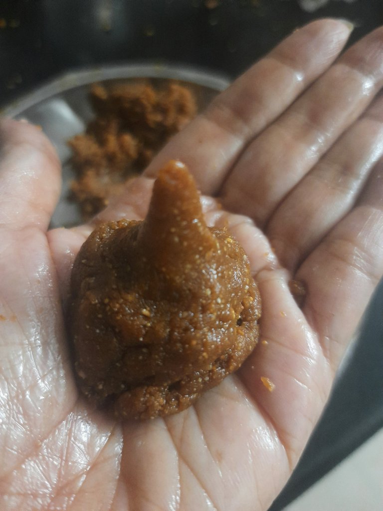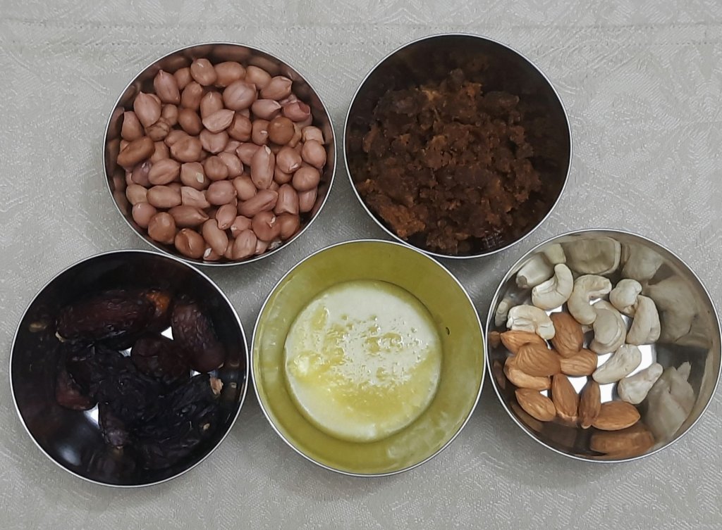 Dry roast peanut for 5-7 minutes in low heat. Cool it , remove skin. To remove skin either rub the peanut between your palms or place the peanut inside a towel and rub it. Grind the peanut. Add the jaggery to the peanut powder and grind again. Add a teaspoon of ghee to the peanut mixture and knead well. Deseed the dates and grind well. Powder the dry-fruits add this to the dates add 1/2 tsp ghee mix well and make small balls. Take small quantity of peanut-jaggery mixture, flatten them and give a circular shape. Now place a dates- dry-fruits ball and slowly cover the dates-dry-fruits with peanut-jaggery mixture and shape it into a Modak. Lord Ganesh prasad is ready.