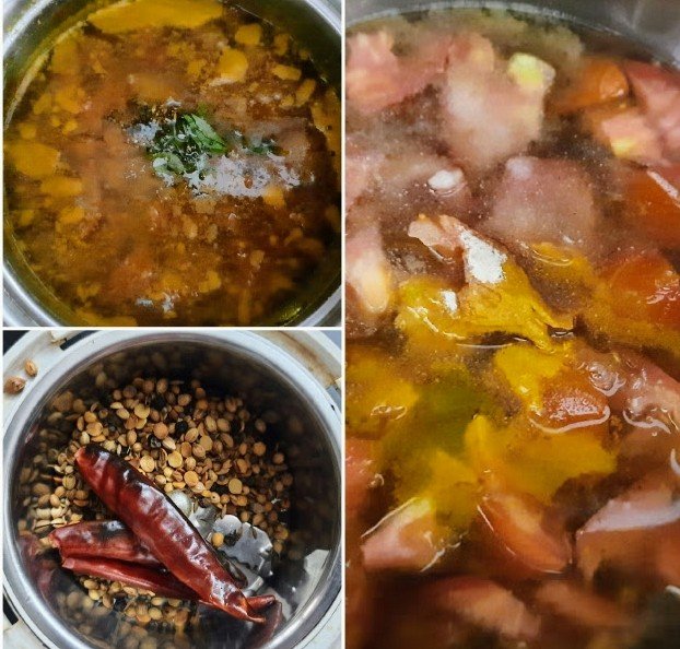 Toor Dal — 1/4 cup Tamarind —- Lemon size Tomatoes —– 2 Turmeric pwd —- 1/4 tsp Salt —– 1 tsp Asafetida —- 1/4 tsp Jaggery —– 1 tsp Mustard seeds —- 1 tsp Cummin seeds —- 1/2 tsp Ghee —- 1 tsp Few curry leaves