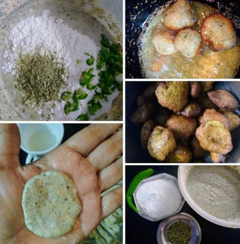 3. How to make remaining adai mav interesting. Add equal amount of rice flour to the adai mav, ie 1 cup adai mav : 1 cup rice flour. Add cut green chillies, powdered sauf and salt. Heat oil in a kadai, take a small portion of the mixture, flatten it in your palm and slowly add this vadai into the oil. You will see the vadai bubble, turn it and remove ones they vadai is red in color. your Bubble vadai is ready. ( Adai is also a type of thick dosai. Grind boiled rice, tuvar dal, channa dal and urad dal, proportion 2: ½ : ½ : ¼ . Grind rice and dal’s separately adding red chili, asafoetida and salt.)