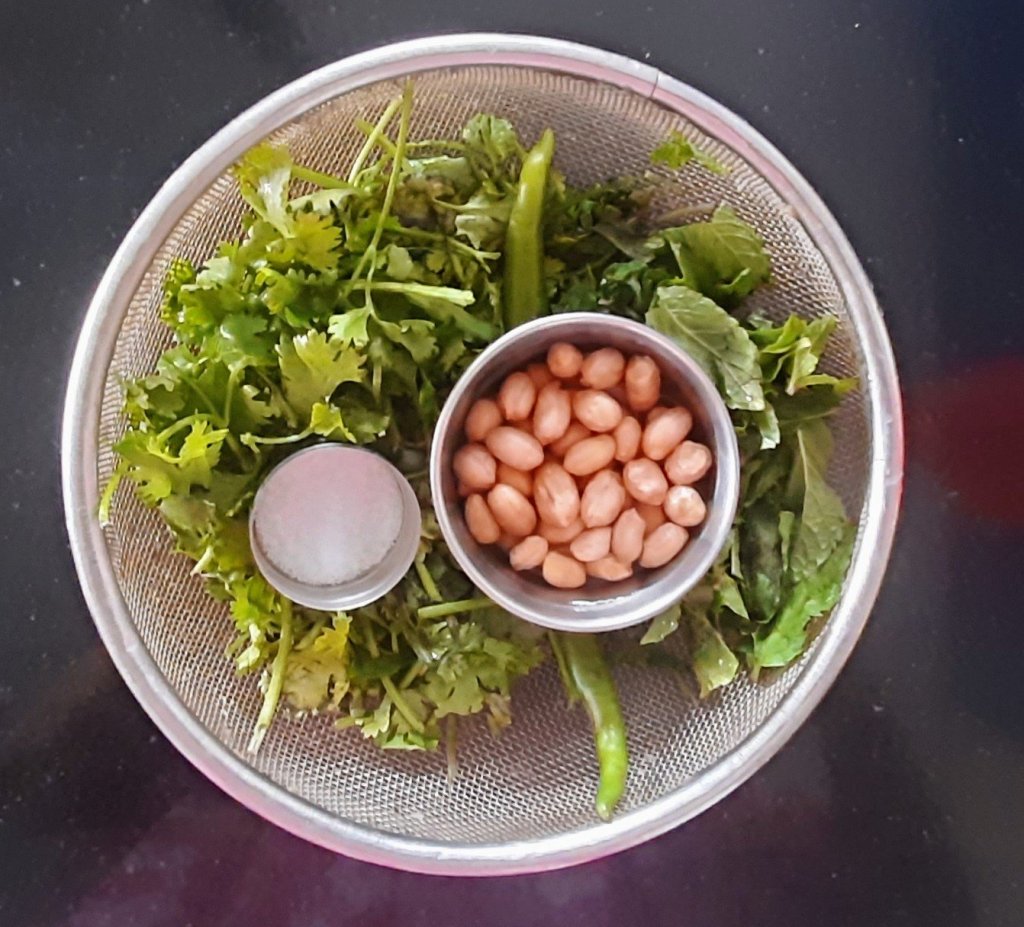 Ingredients Coriander leaves —- 2 cups Mint leaves — 1/2 cup Green chili — 2 Peanut —- 3tbsp Salt —- 1/2 tsp.