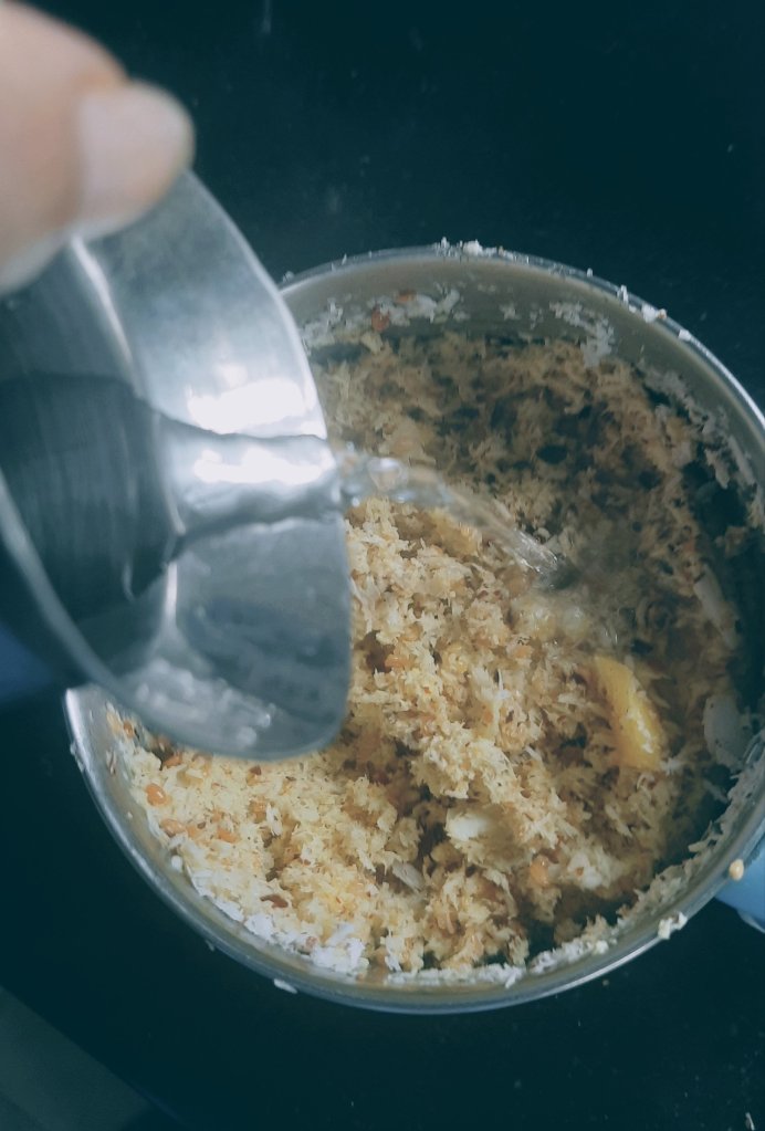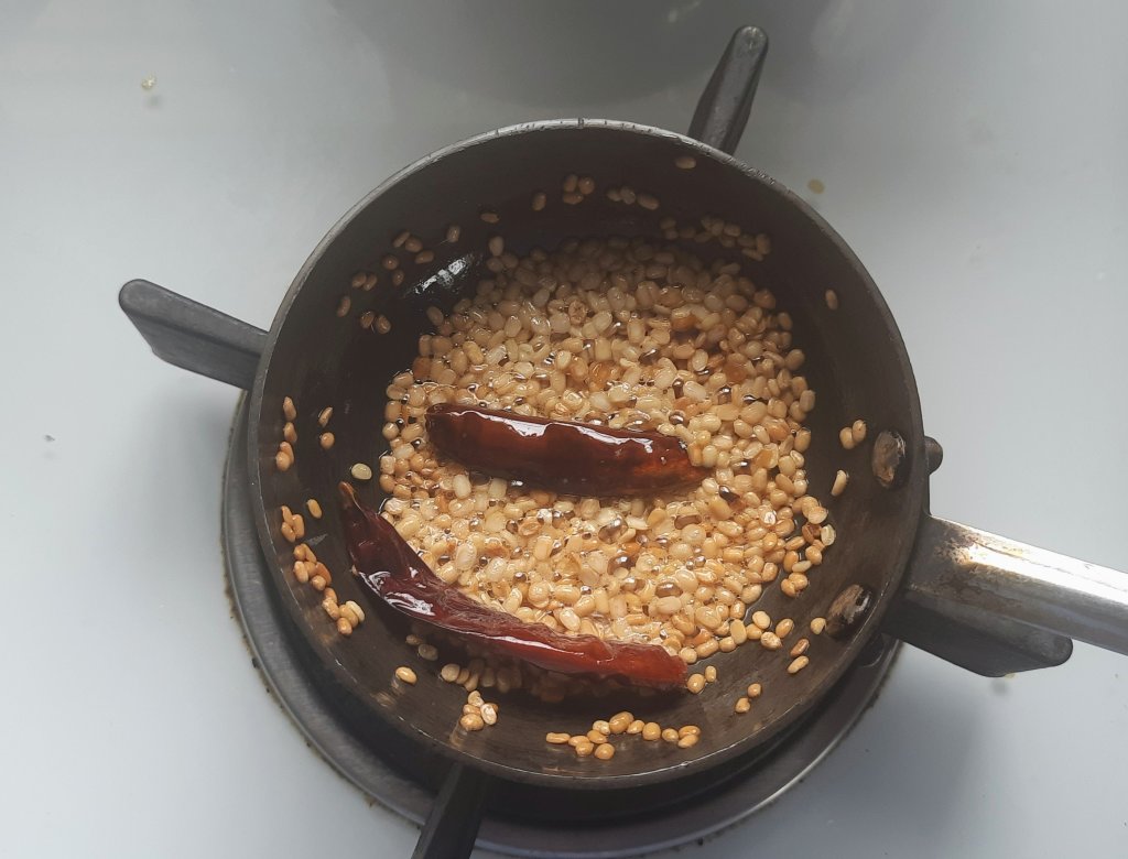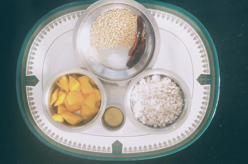 Ingredients Raw mango —- 1/2 cup Coconut —- 1/2 cup Urad dal —– 1 tbsp Dry red chilli —– 2 Asafetida —– 1/4 tsp Salt —– 1/2 tsp Sesame oil —– 1 tbsp.