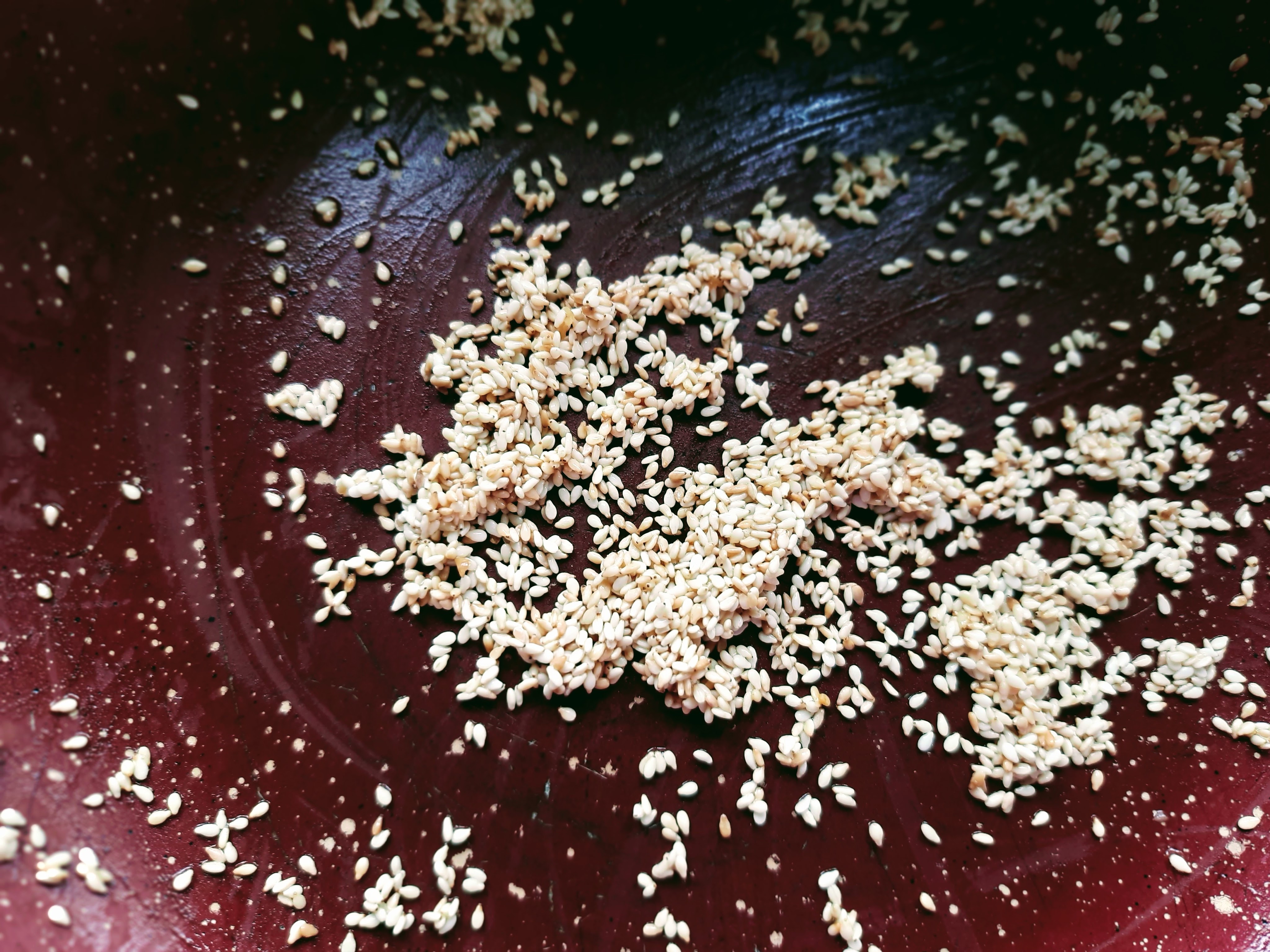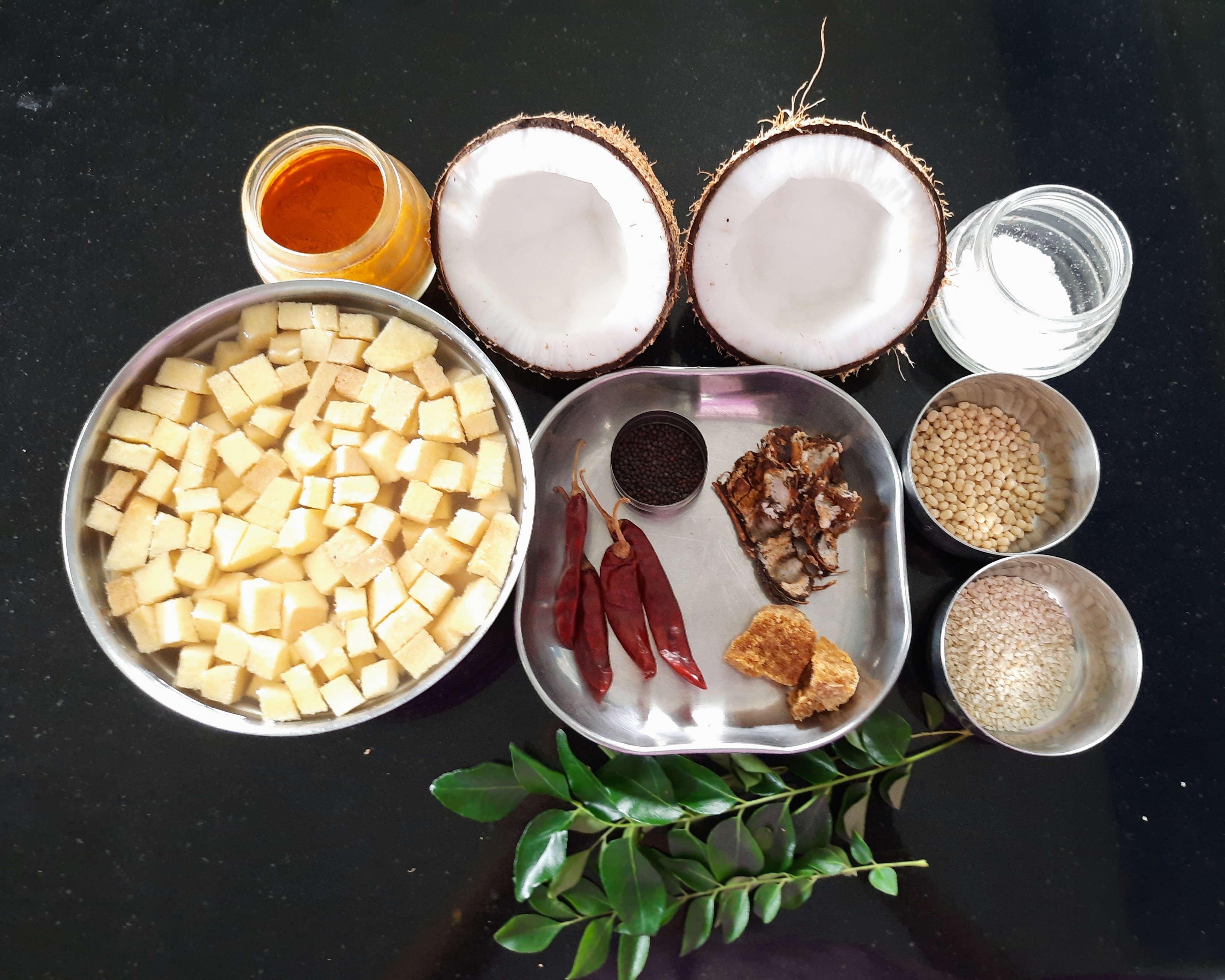 Chenai / yam — 150gms Tamarind —- small lemon size Jaggery —-1 tsp Coconut —– 1 1/2 cup Urad dal —- 1 tbsp Dry red chilli — 4 Ellu / Sesame — 1 tbsp Mustard seeds—- 1/2 tsp Turmeric—– 1/4 tsp Asafoetida —- 1/4 tsp Salt —– 1 tsp Oil —- 2 tbsp Few curry leaves