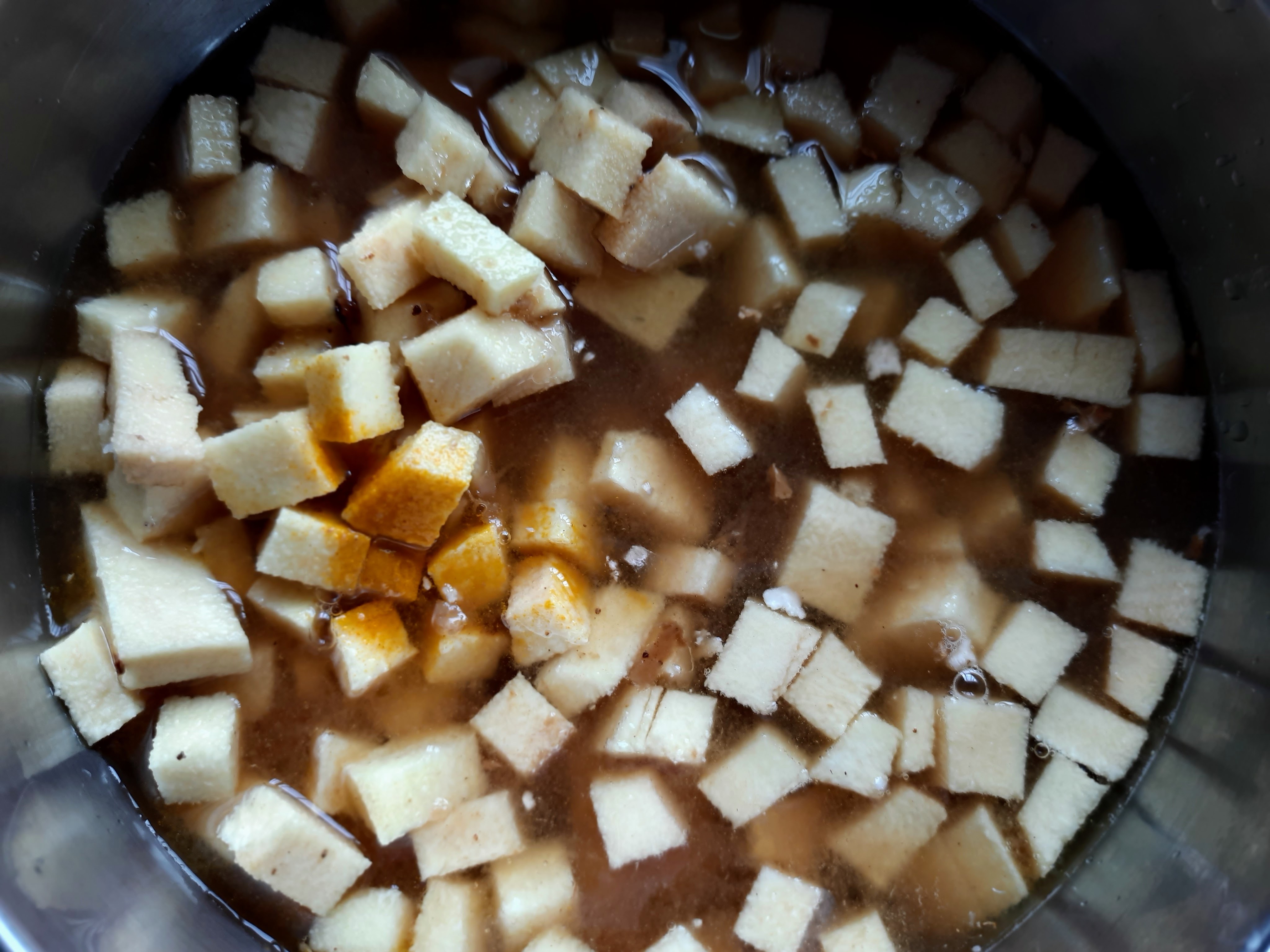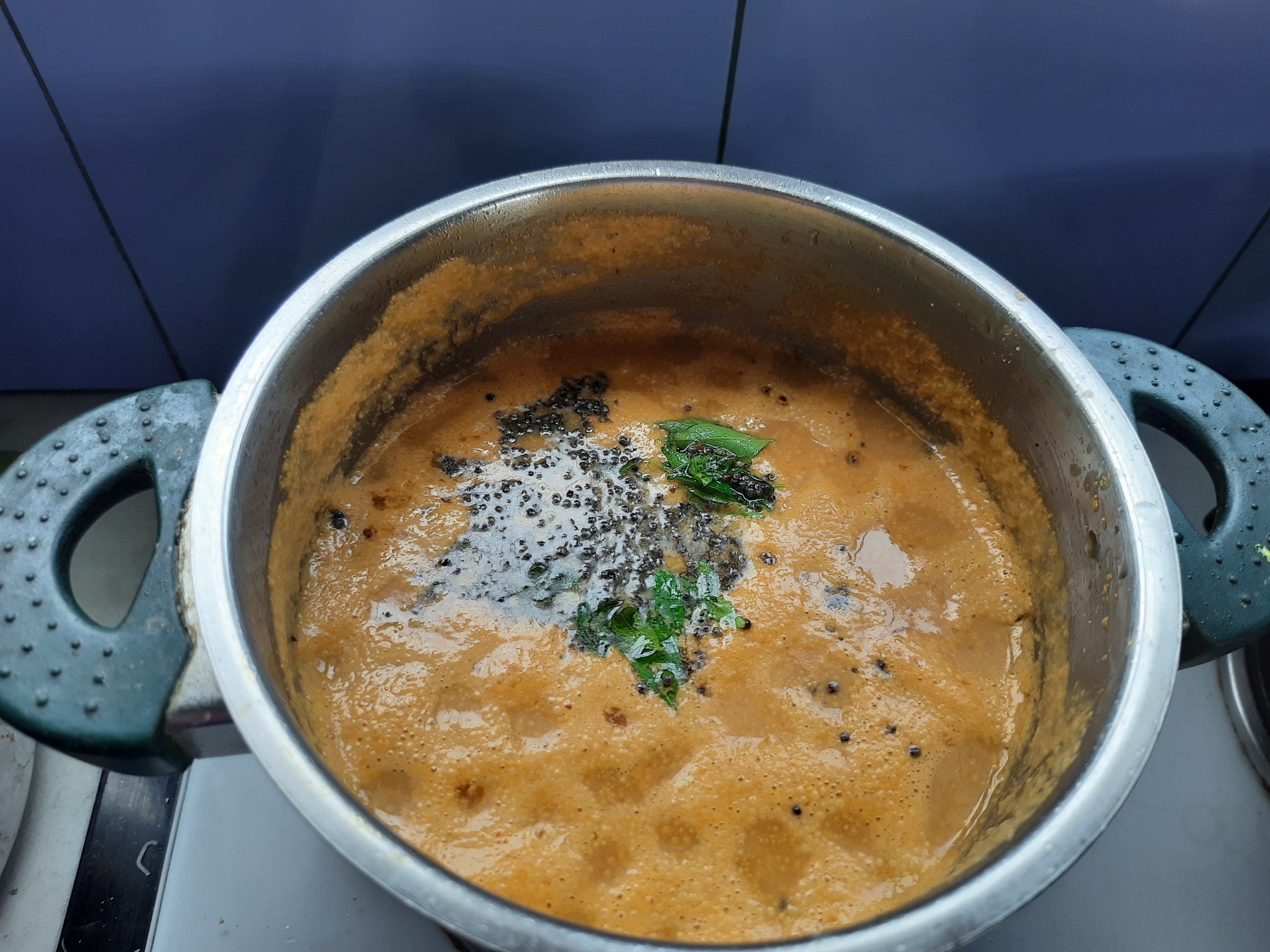 Method t Cut the chenai into small cubes. Soak the tamarind in water. Add turmeric, salt and asafetida to the chenai and cook them tamarind water. Meanwhile heat one tbsp oil and fry the urad dal and dry red chilli, keep it aside. Next fry thr Sesame seeds till the change color. Now grind together Coconut, fried urad dal, red chilli and fried sesame seeds adding water. Once the chenai is cooked add the grounded coconut paste, adding extra water to get the right consistency. When the kootan starts to boil put off the heat. Heat the remaining oil, add the mustard seeds when they crackle add the curry leaves. Add this the kootan. Chenai-Ellu Kootan ready.