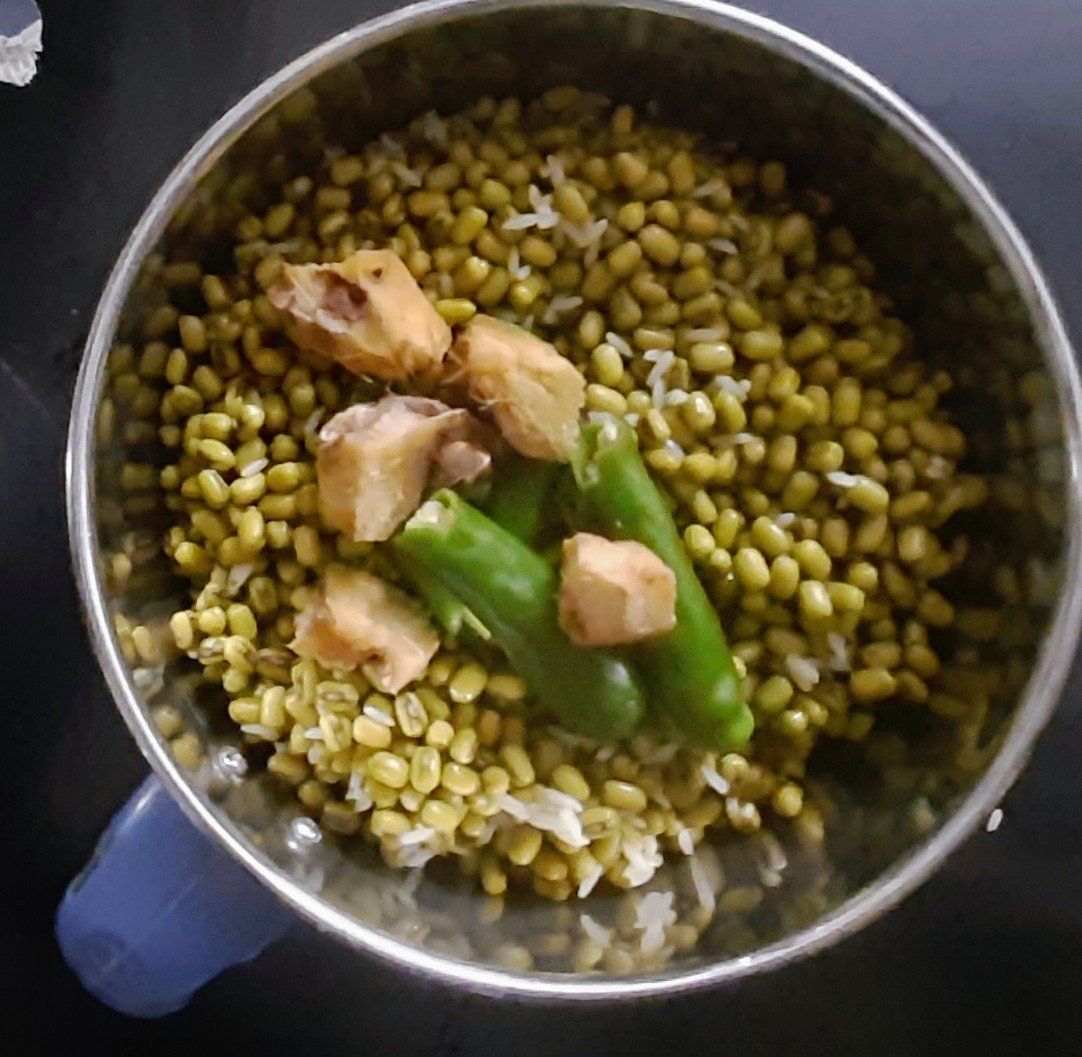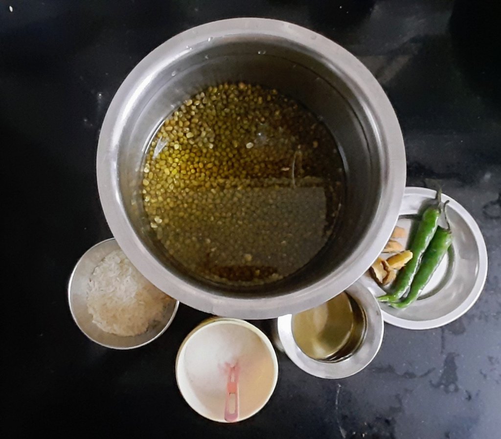 Whole moong —– 2 cup Raw Rice —- 2 tbsp Green chili —- 2 Ginger — 1 inch Salt —- 1 tsp