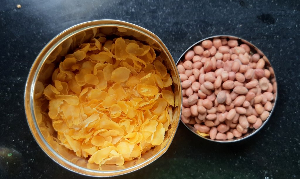 Raw Cornflakes — 4 cups Peanut —- 1 cup Oil for frying.