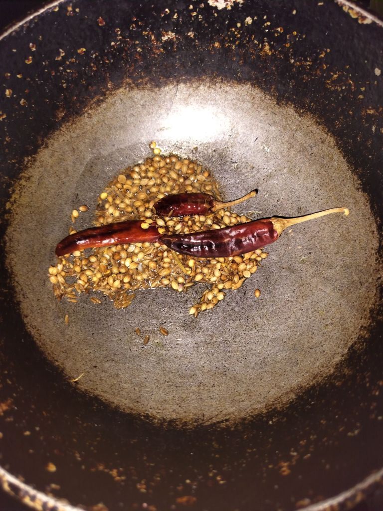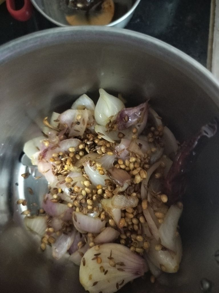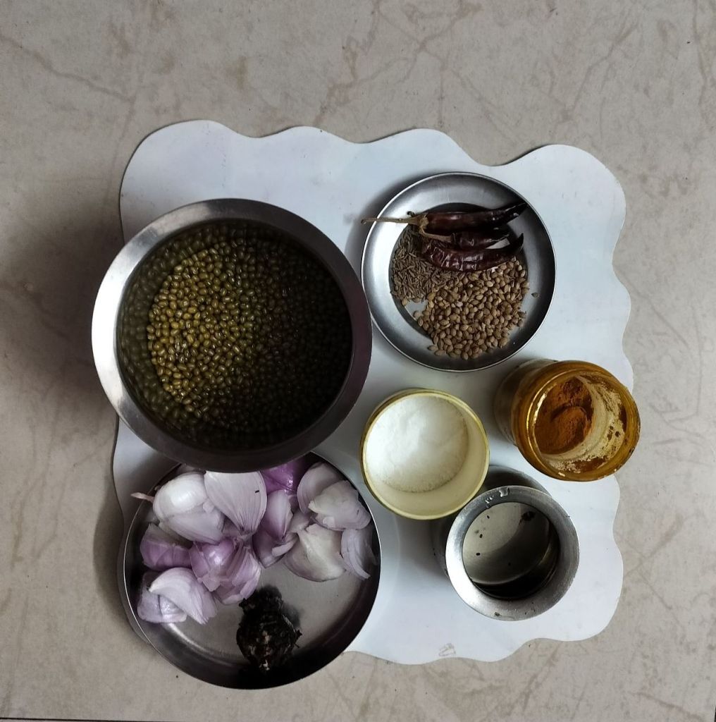 Whole Moong — 1 1/2 cup, Onion — 2, Dry red chilli 3/4, coriander seeds — 1tbsp, Cummins seeds — 1/2 tbsp, Turmeric powder — 1/2 tsp, Salt—-1tsp. Oil– 2-3 tsp. Tamarind —small lemon size