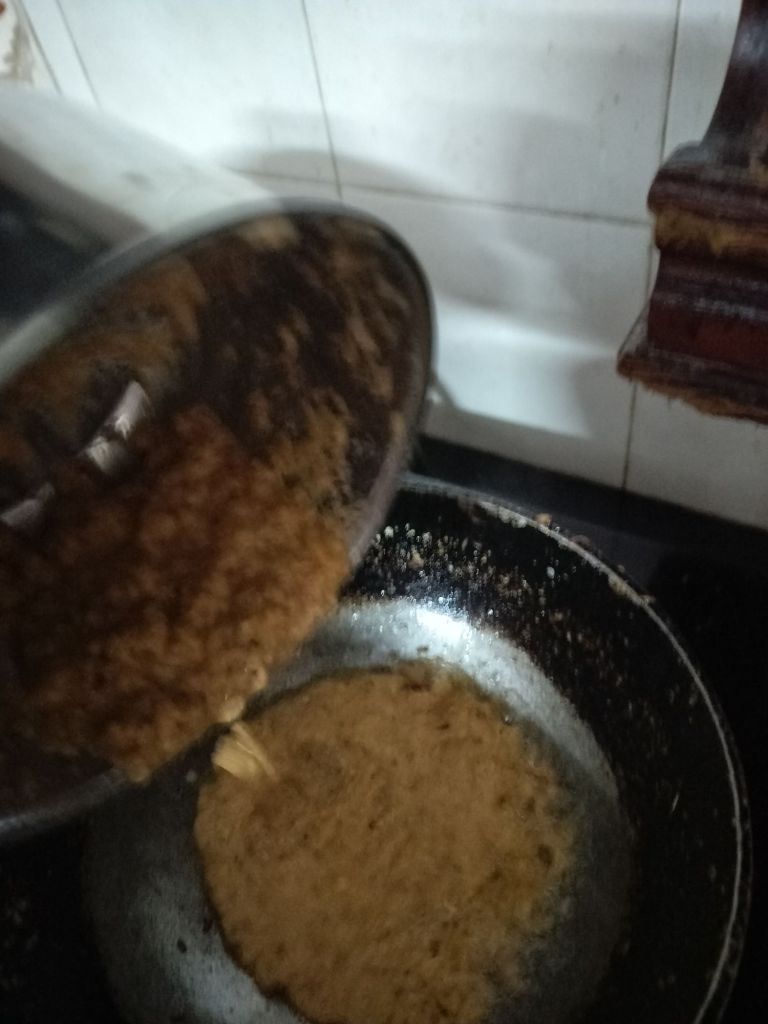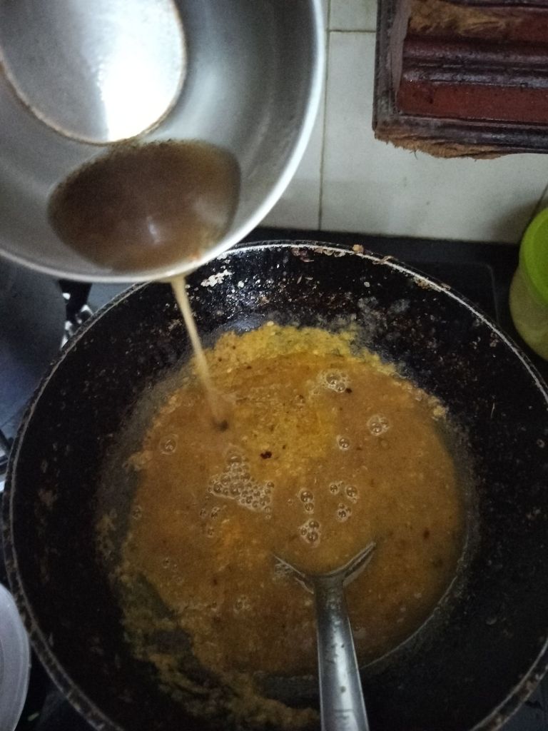 Rinse and soak the moong dal with 15mnts and pressure cook it. Soak the tamarind in the glass of water.Meanwhile heat oil and the fry ingredients for mnts, next add the cut onion and again fry for 2mnts. Cool the fried ingredients and grind it. Add this to cook moong dal and cook it in low heat for 2-3 mnts. Then add the tarmind water and further cook it 2-3 mnts until everything comes together. Moongdal for Putta is ready.
