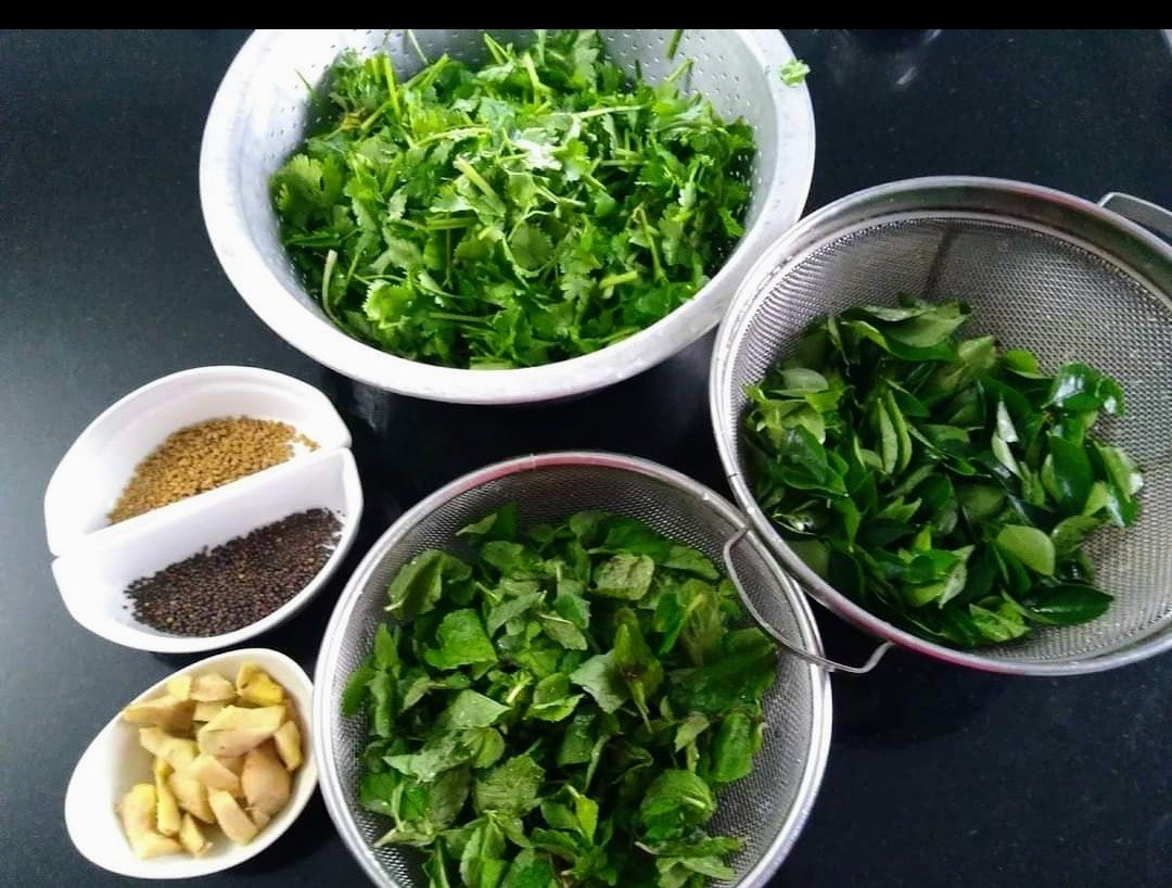Take a pan pour 1 tablespoon oil ,fry 7 red chillies, remove. In the same oil add ginger, coriander leaves and mint leaves fry for about 2-3 mnts, then add the curry leaves and fry for a mnt.