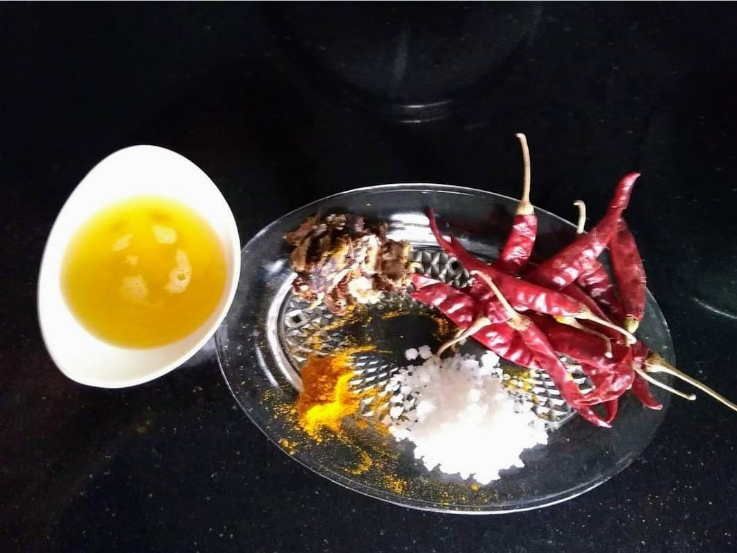 After it cools grind together, fried red chilli, all 3 leaves with ginger, tamarind, turmeric pwd and salt adding little water.