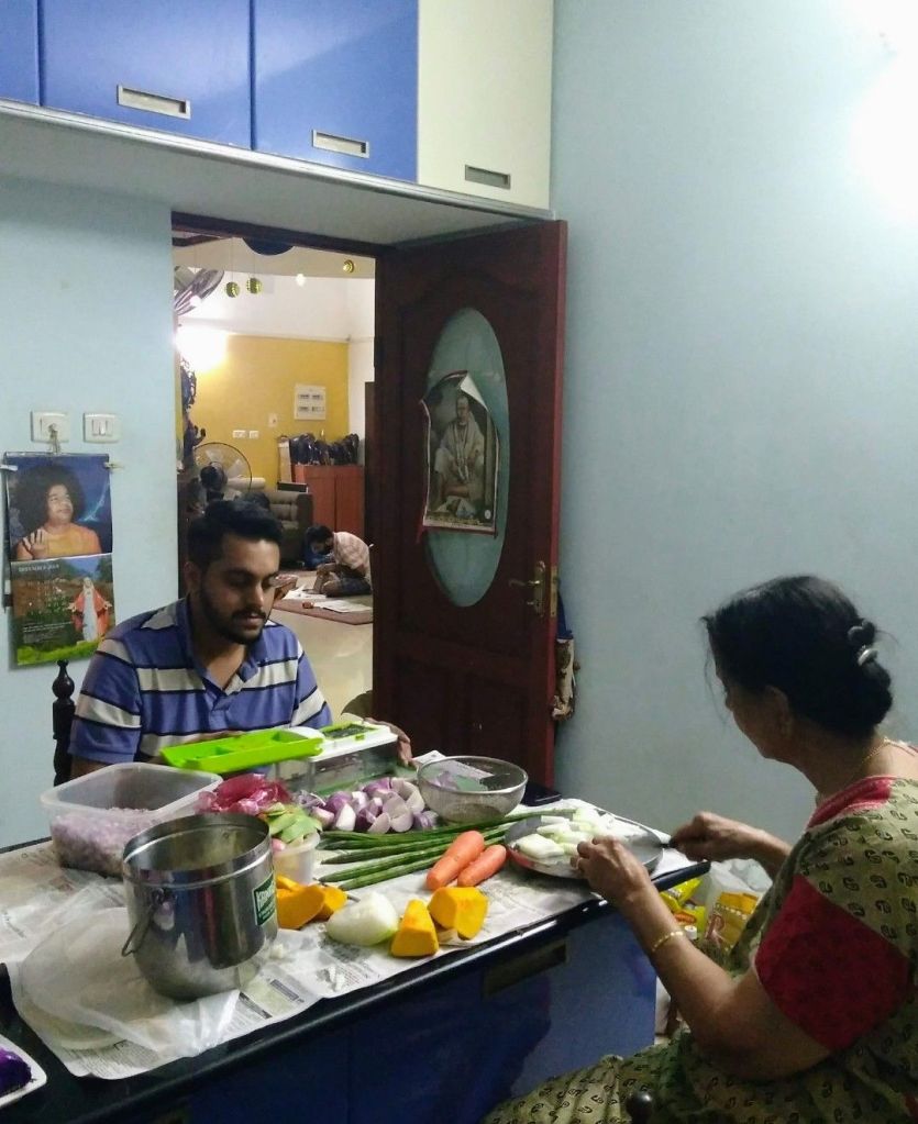 Sai centre where food is a large quantity for distribution among the needs.Orphanages Sai centre with my husband My daughter SindhujaMy son Sidharth and my grandson Rudradev My Amma with my son